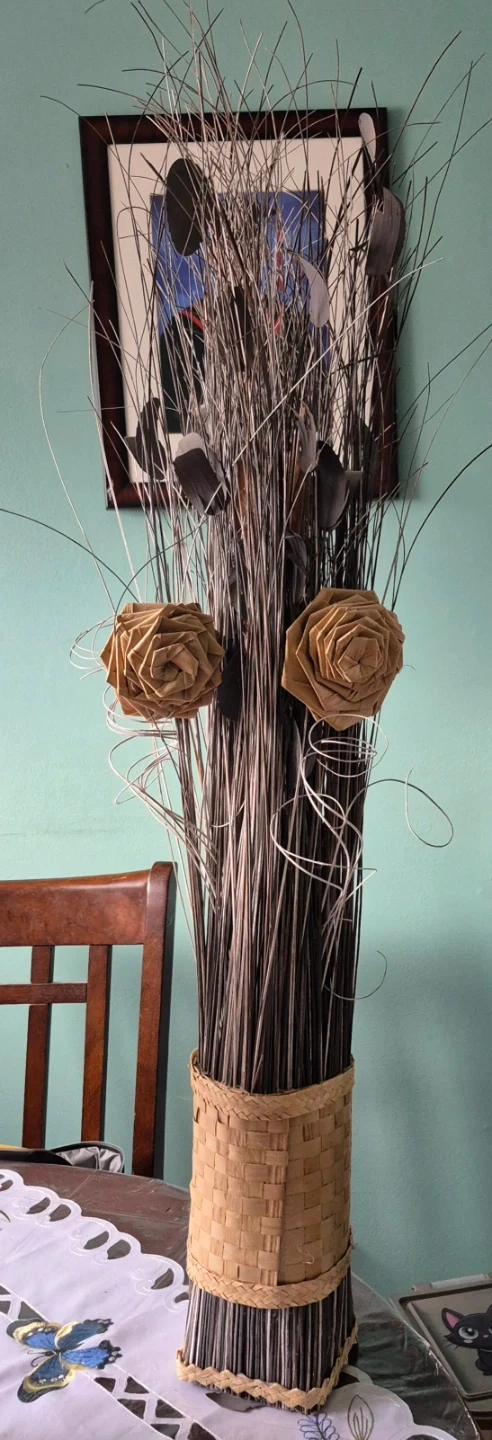 This decorative arrangement features dried grasses and two paper flowers. It's housed in a woven basket base. Adds a natural touch to any room.