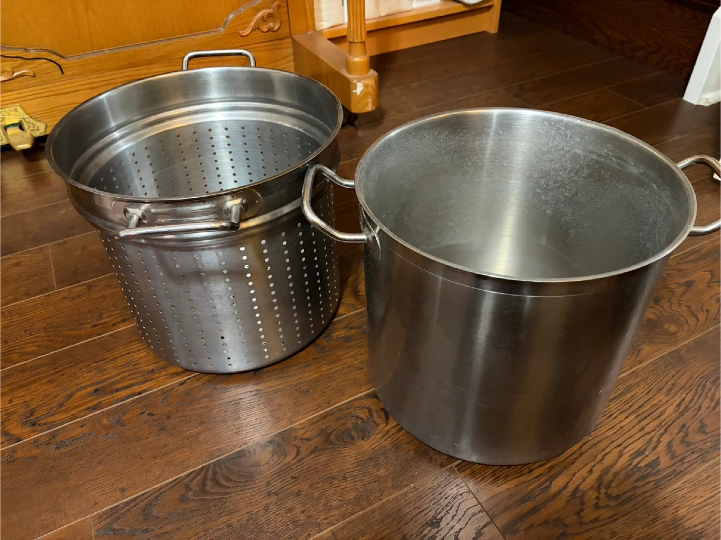 This is a large stainless steel stock pot. It comes with a perforated steamer basket insert. Great for boiling, steaming, or making stock!