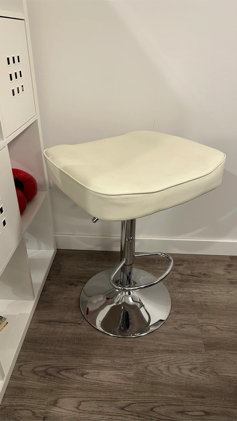Selling a gently used (bigger square one )small one is brand new adjustable rolling swivel stool. It's in great condition and perfect for a variety of uses around the house or in a studio. The stool features a comfortable white seat and a sturdy chrome base with smooth-rolling casters.