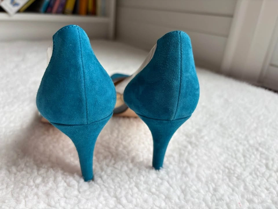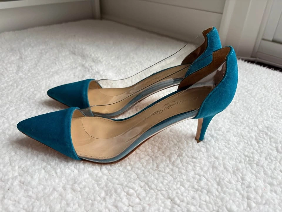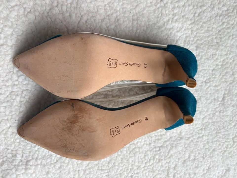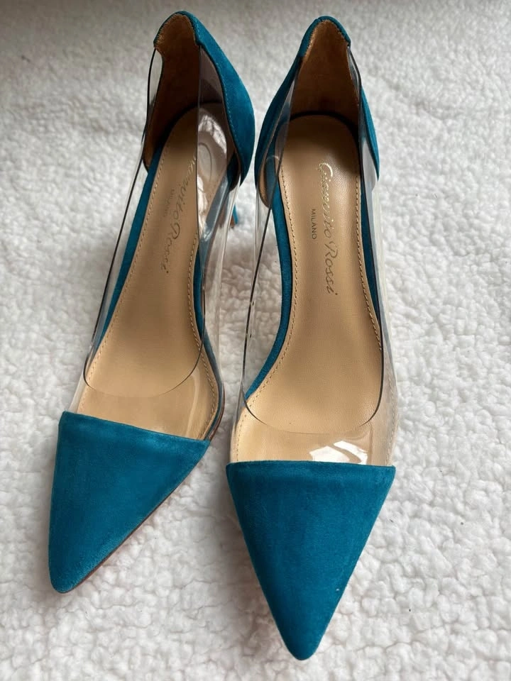 Gianvito Rossi Teal Blue Suede Plexi Heels (Size 37)