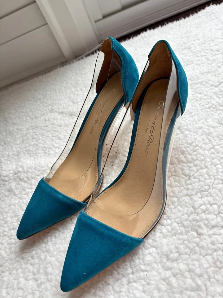 Gianvito Rossi Teal Blue Suede Plexi Heels (Size 37)