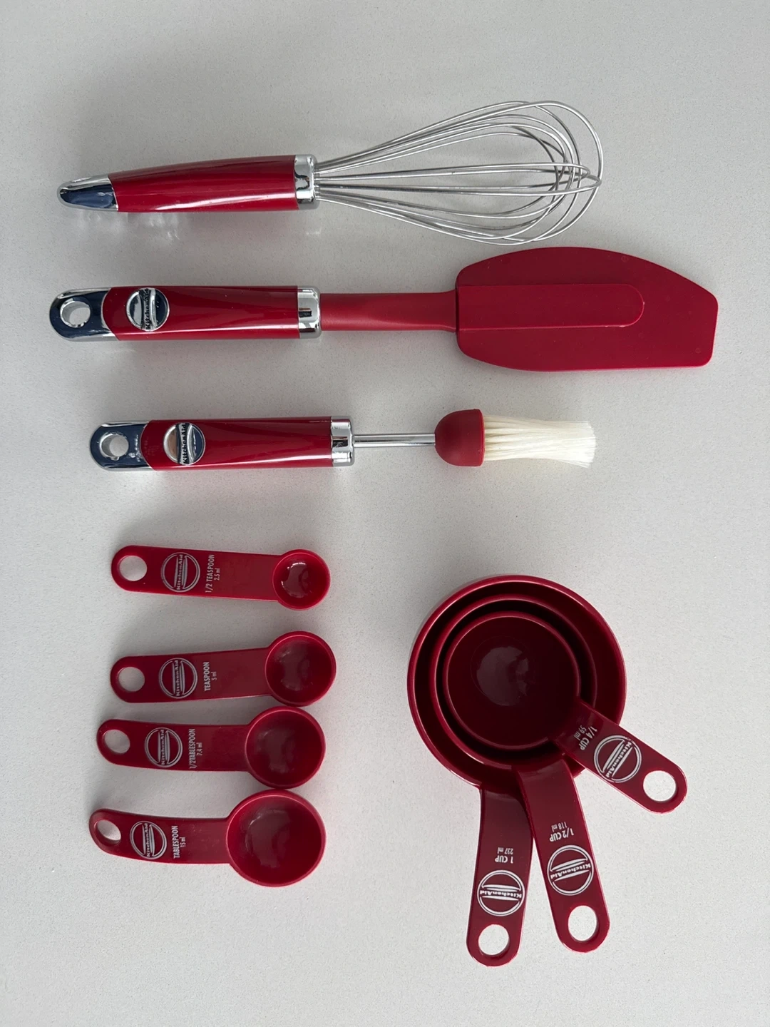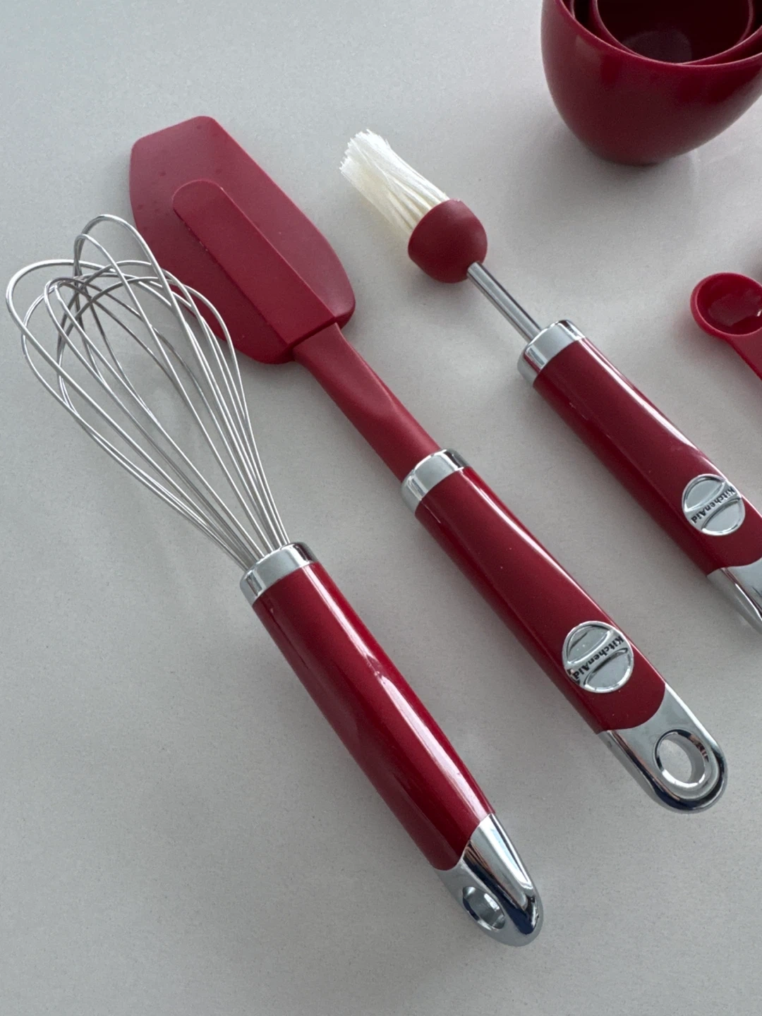 KitchenAid kitchen utensil set in red! This set includes measuring cups, measuring spoons, a whisk, a spatula, and a basting brush. Perfect for any home baker or cook!