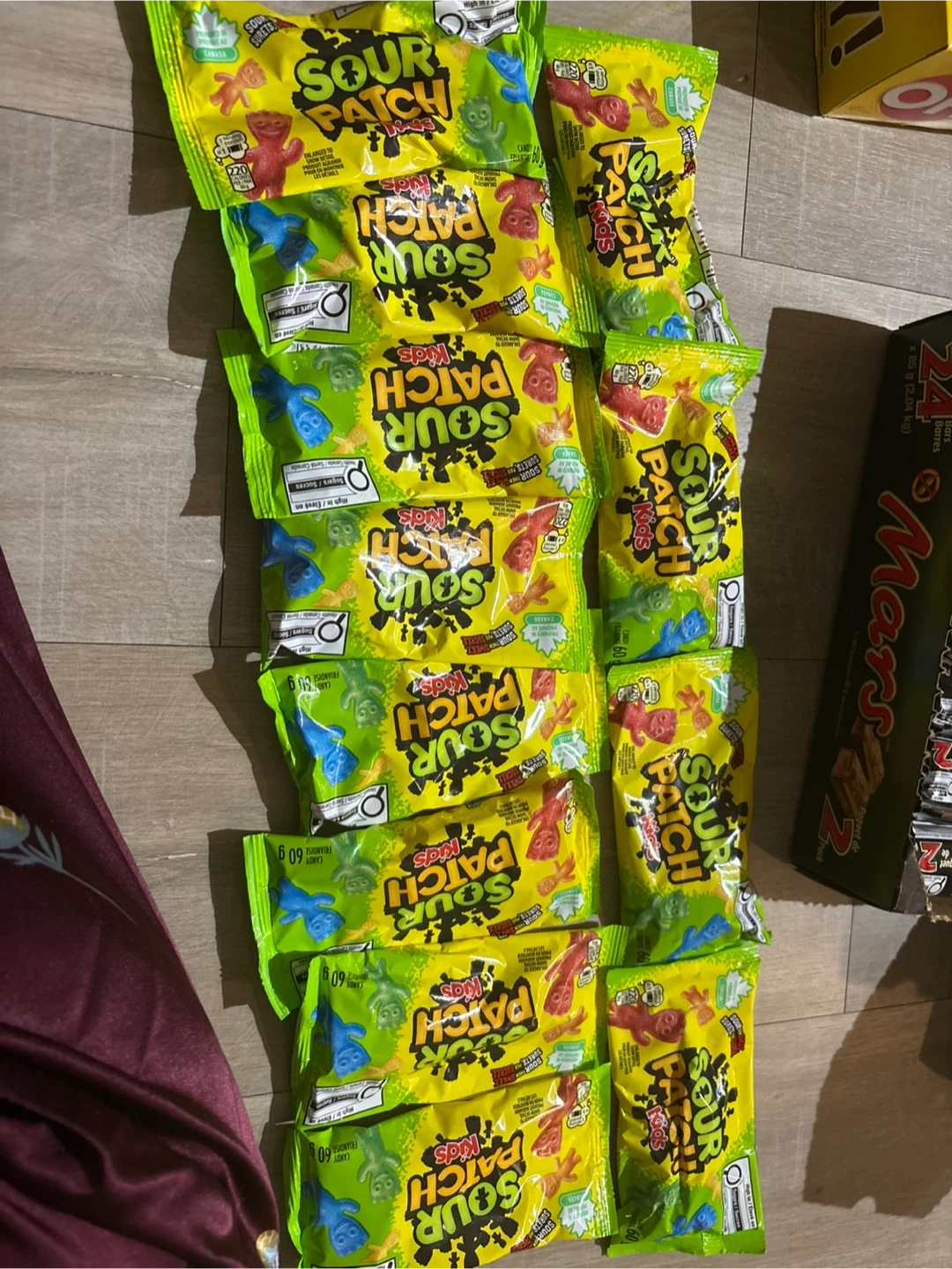This is a box of Sour Patch Kids candy, containing ten individual bags. Each bag is 64g. Perfect for sharing or for a sweet and sour treat!