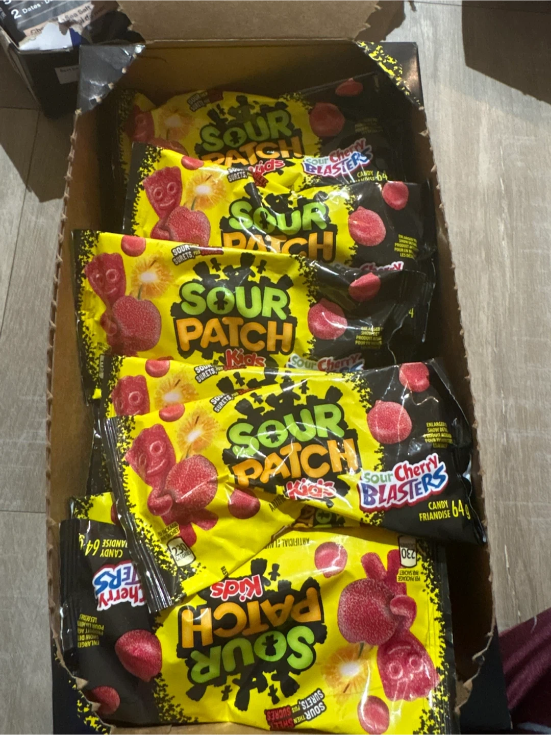 This is a box of Sour Patch Kids candy, containing ten individual bags. Each bag is 64g. Perfect for sharing or for a sweet and sour treat!