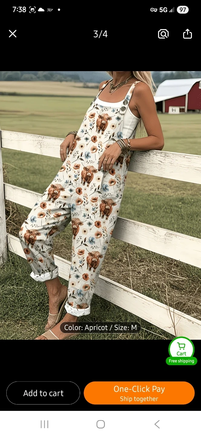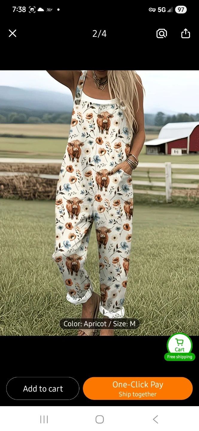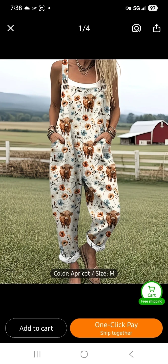 These women's overalls feature a cute highland cow and floral print. They're apricot coloured and comfortableto wear. It has adjustable straps and pockets.