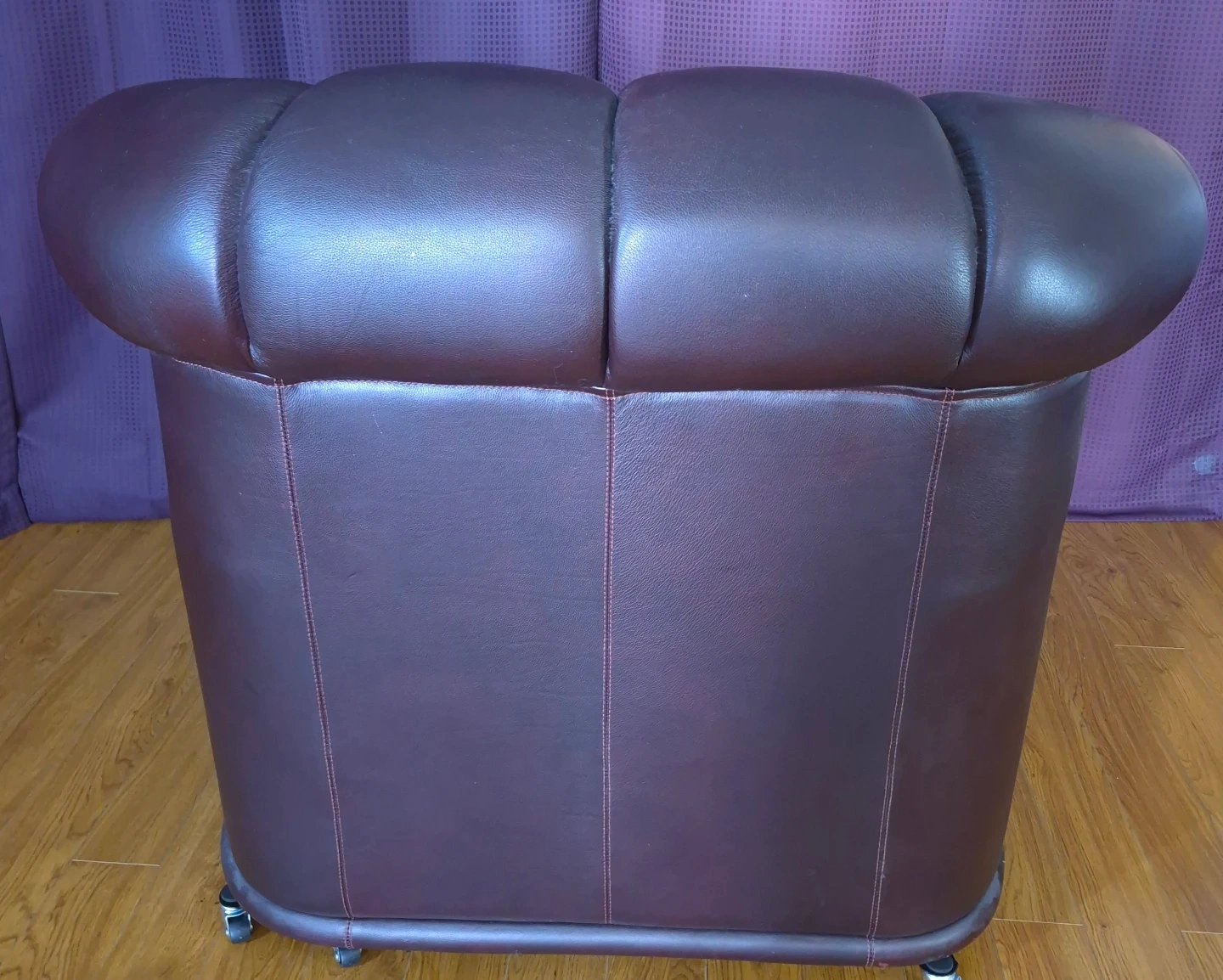 Burgundy armchair with tufted back and seat. Upholstered in faux leather with brass stud detailing. Features a curved back and rolled arms. Includes casters for easy movement. Seat width is 50cm, seat depth is 38cm, seat height is 38cm, and back height is 37cm. 2 units