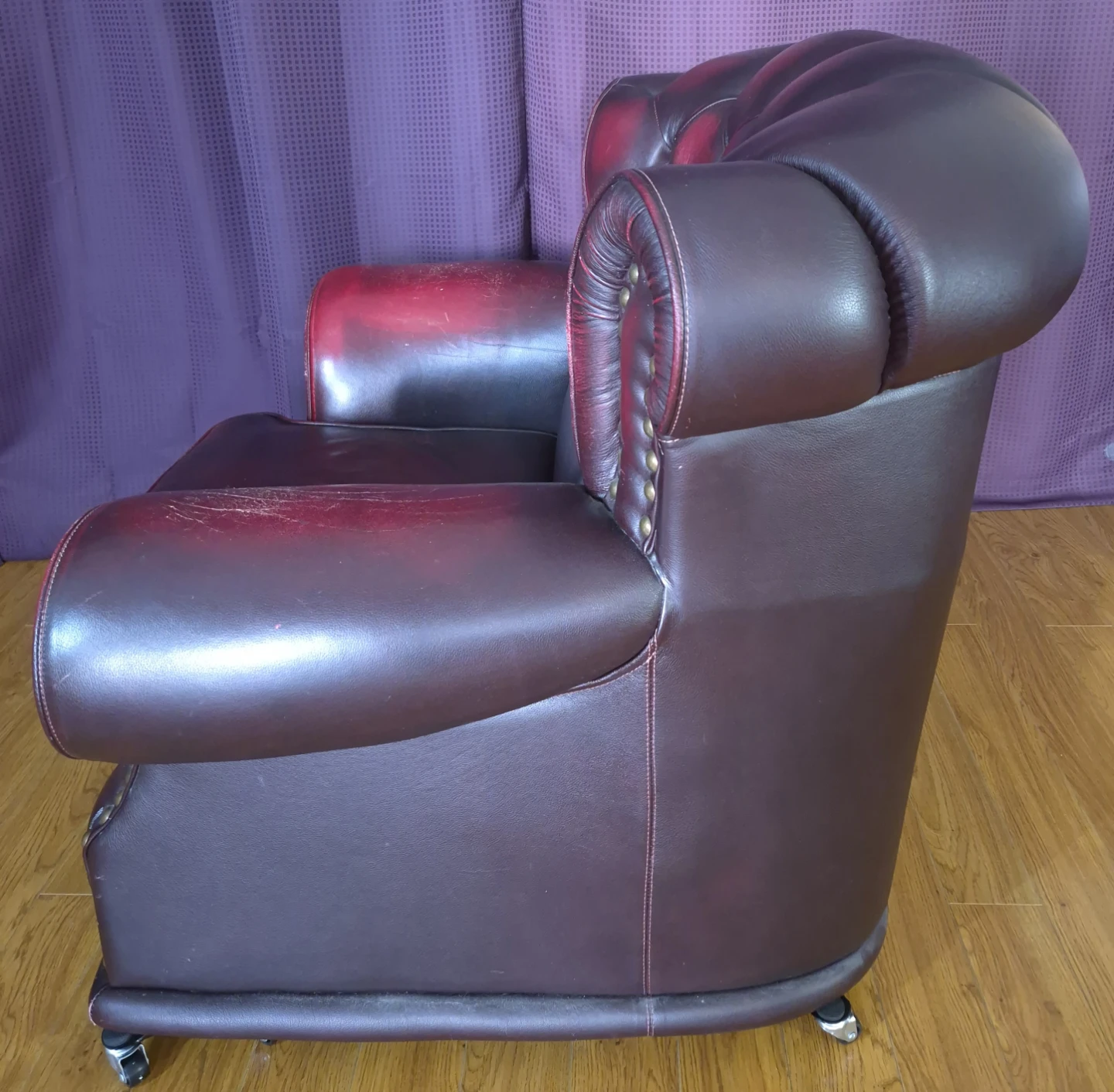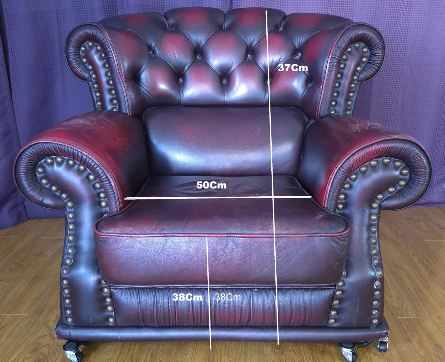 Burgundy armchair with tufted back and seat. Upholstered in faux leather with brass stud detailing. Features a curved back and rolled arms. Includes casters for easy movement. Seat width is 50cm, seat depth is 38cm, seat height is 38cm, and back height is 37cm. 2 units