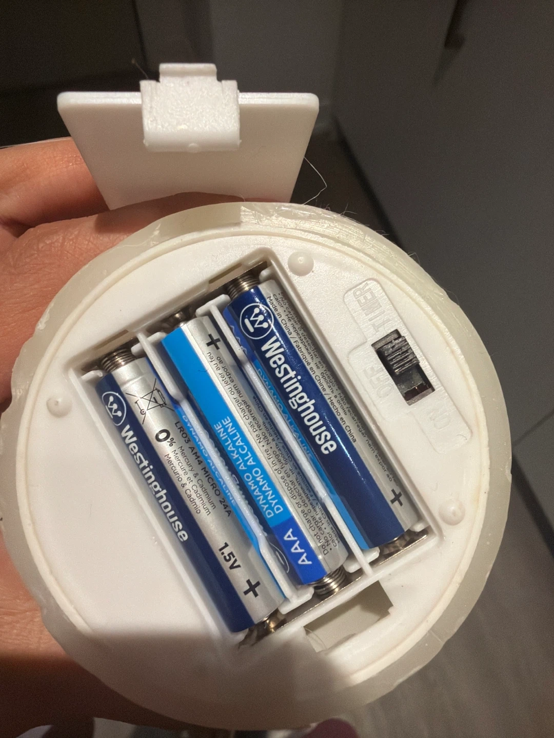 This is a cream-coloured LED pillar candle from Westinghouse. It's battery-operated, using 3 AAA batteries. The candle has an ON/OFF switch and a timer function.