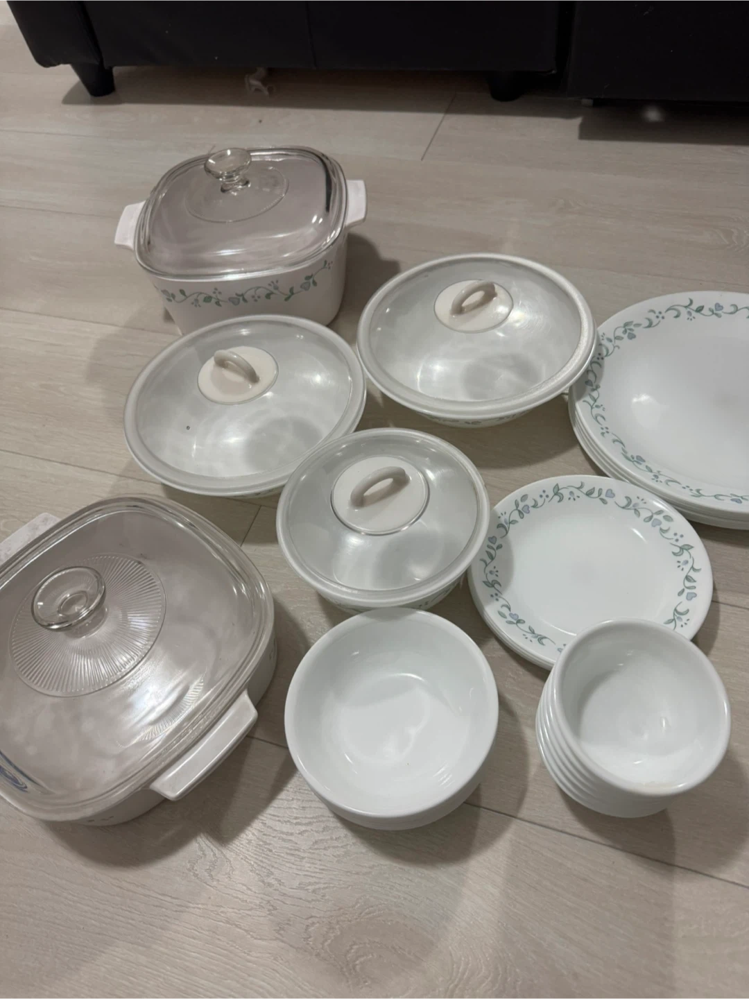 This Corelle set includes 36 pieces sets. It's ideal for serving and storing food. Dishware is white with a delicate blue floral pattern.
