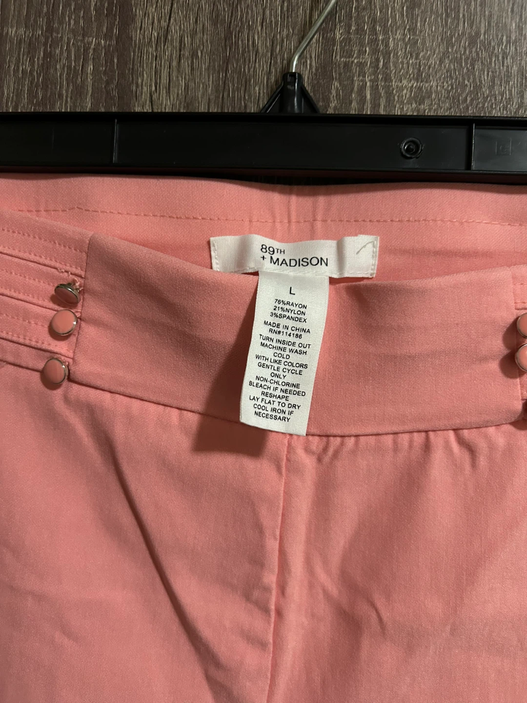 These 89th + Madison capri pants are a lovely shade of pink and in great condition! They're a size large and made of 76% rayon, 21% nylon, and 3% spandex.