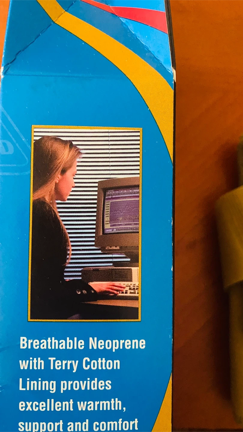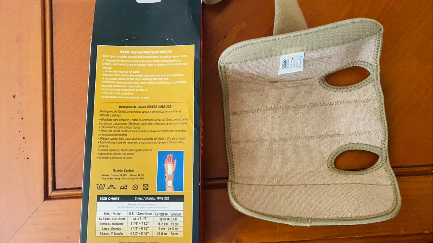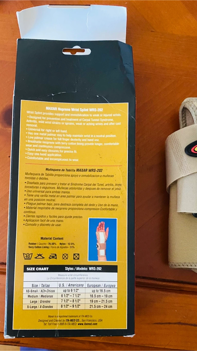 MAXAR WRS-202 wrist splint for support and immobilization. Made with breathable neoprene and terry cotton lining. Features a removable metal palmar stay for neutral wrist positioning. Quick and easy closures for precise fit. Adult size, large, in beige.