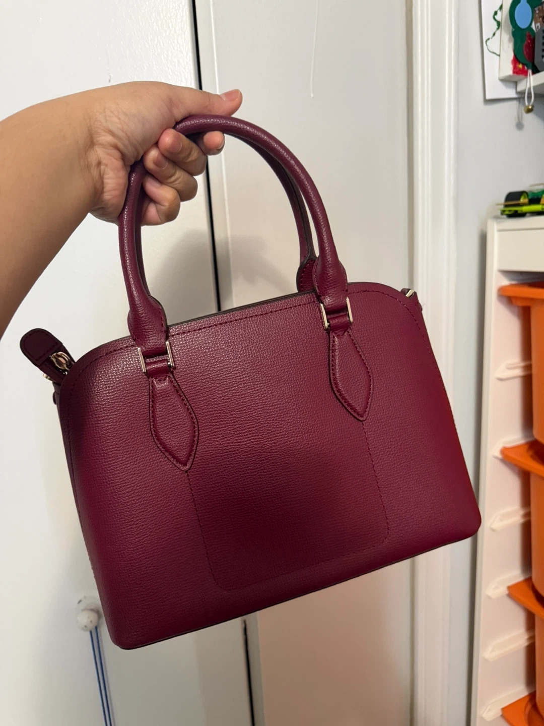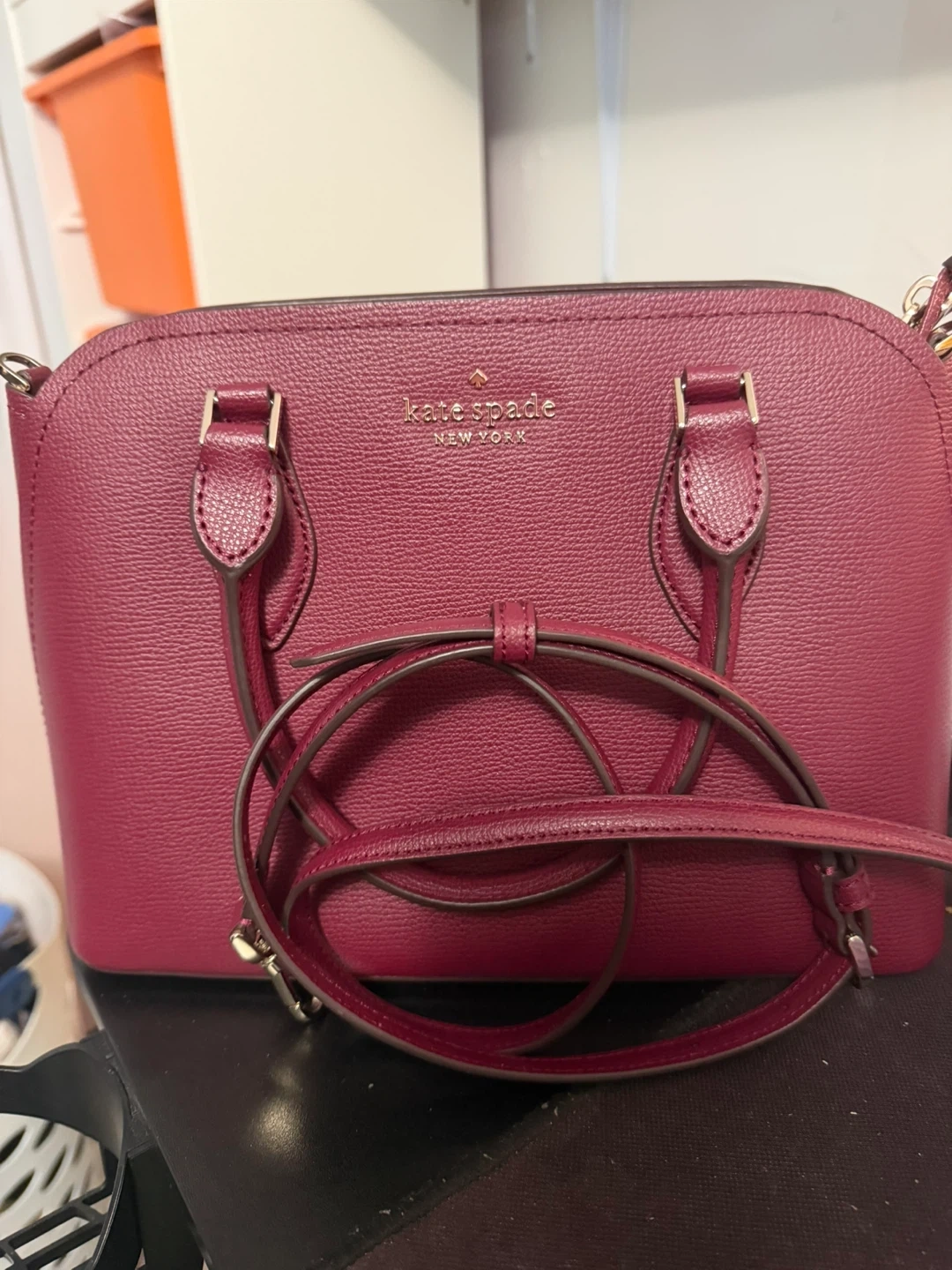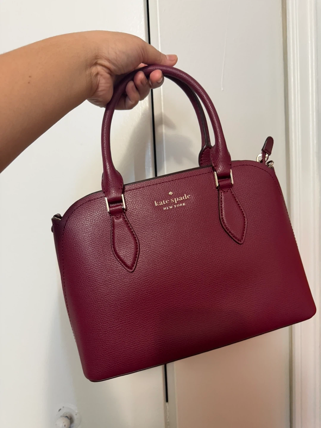 A stylish Kate Spade New York dome satchel handbag. It's made of textured burgundy leather with gold-tone hardware. Includes a detachable shoulder strap for versatile carrying.