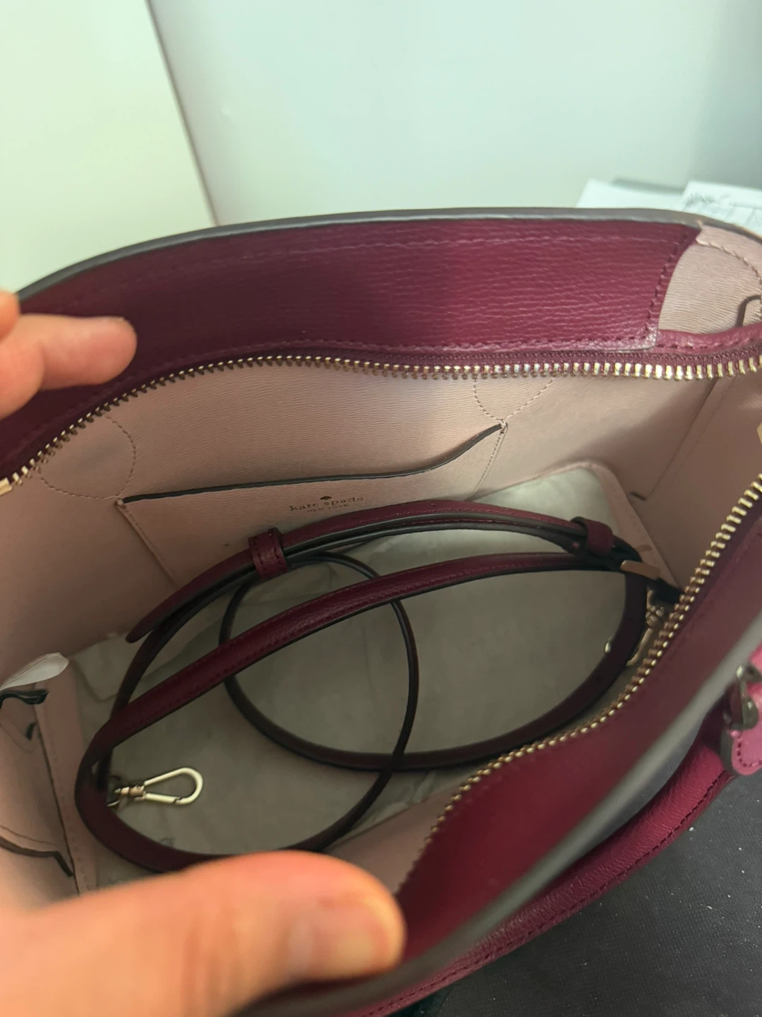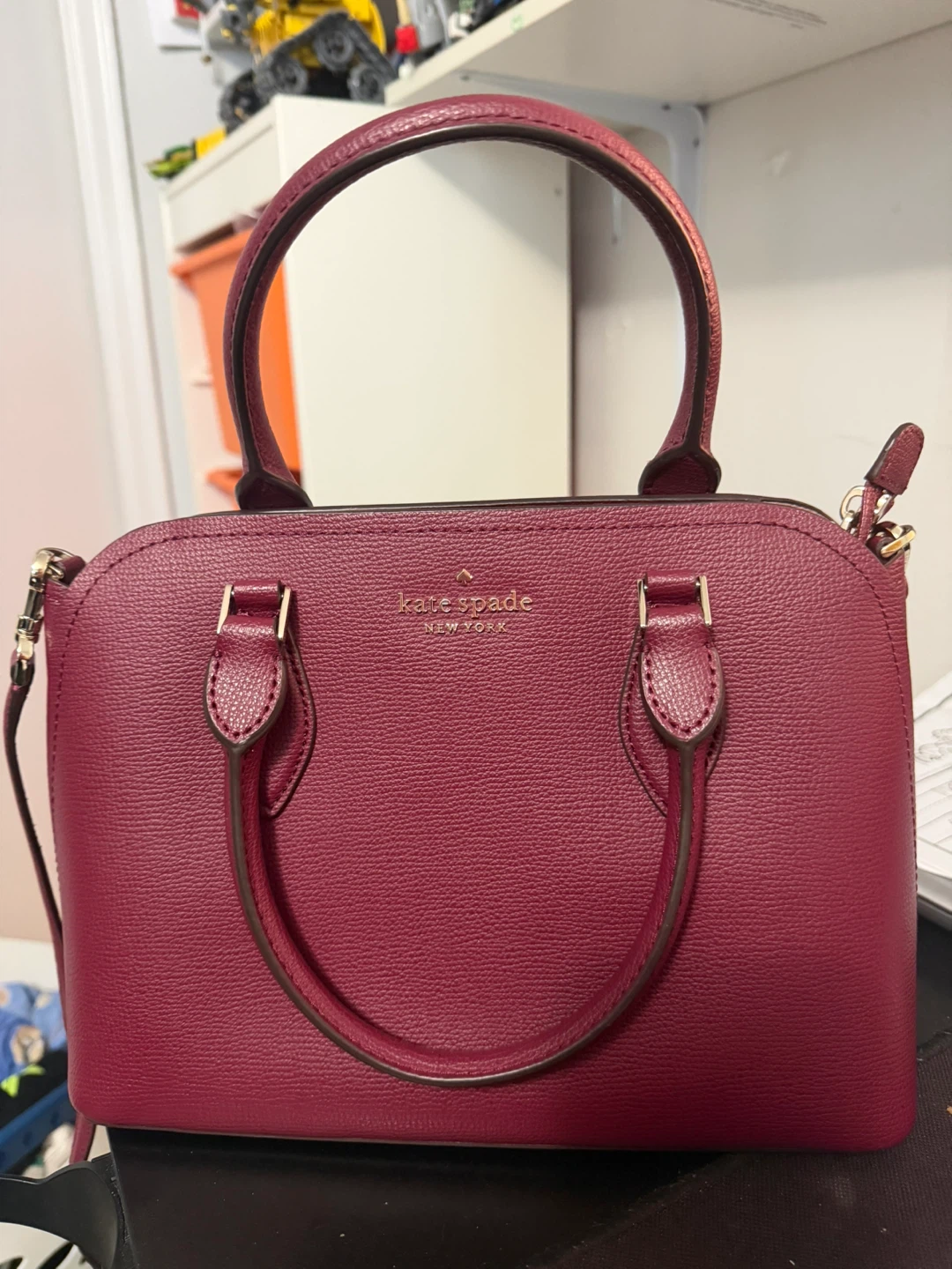 A stylish Kate Spade New York dome satchel handbag. It's made of textured burgundy leather with gold-tone hardware. Includes a detachable shoulder strap for versatile carrying.