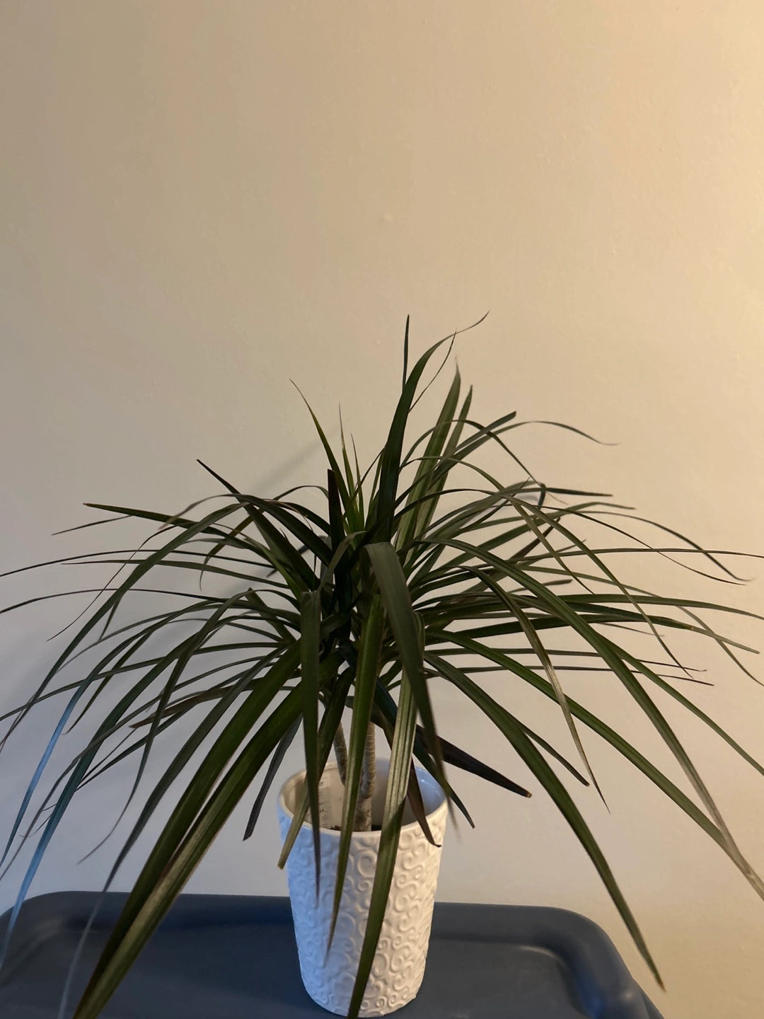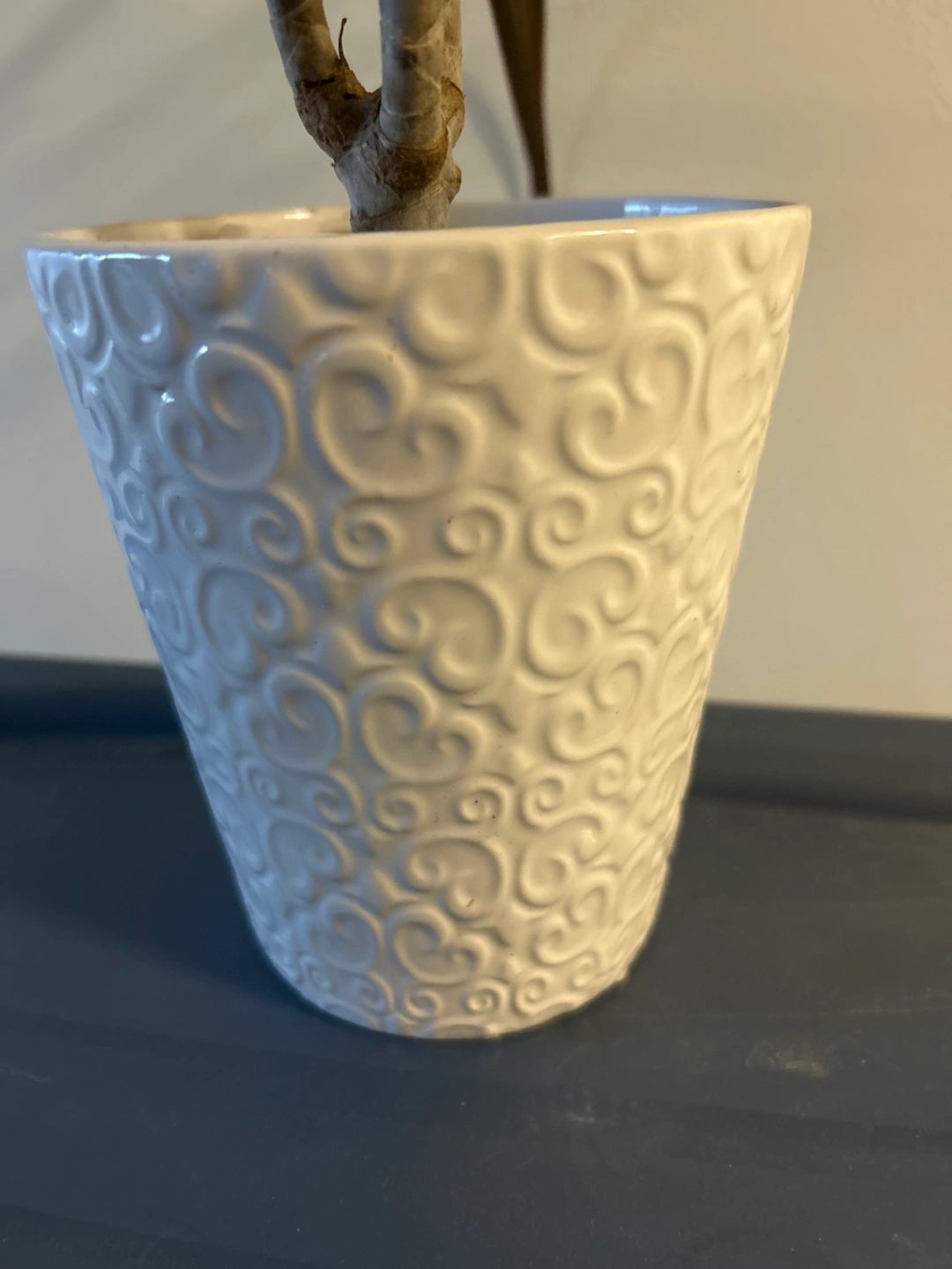 A lovely Dracaena plant in a decorative white pot. The plant is approximately 21 inches tall. It's a great addition to any home or office space!
