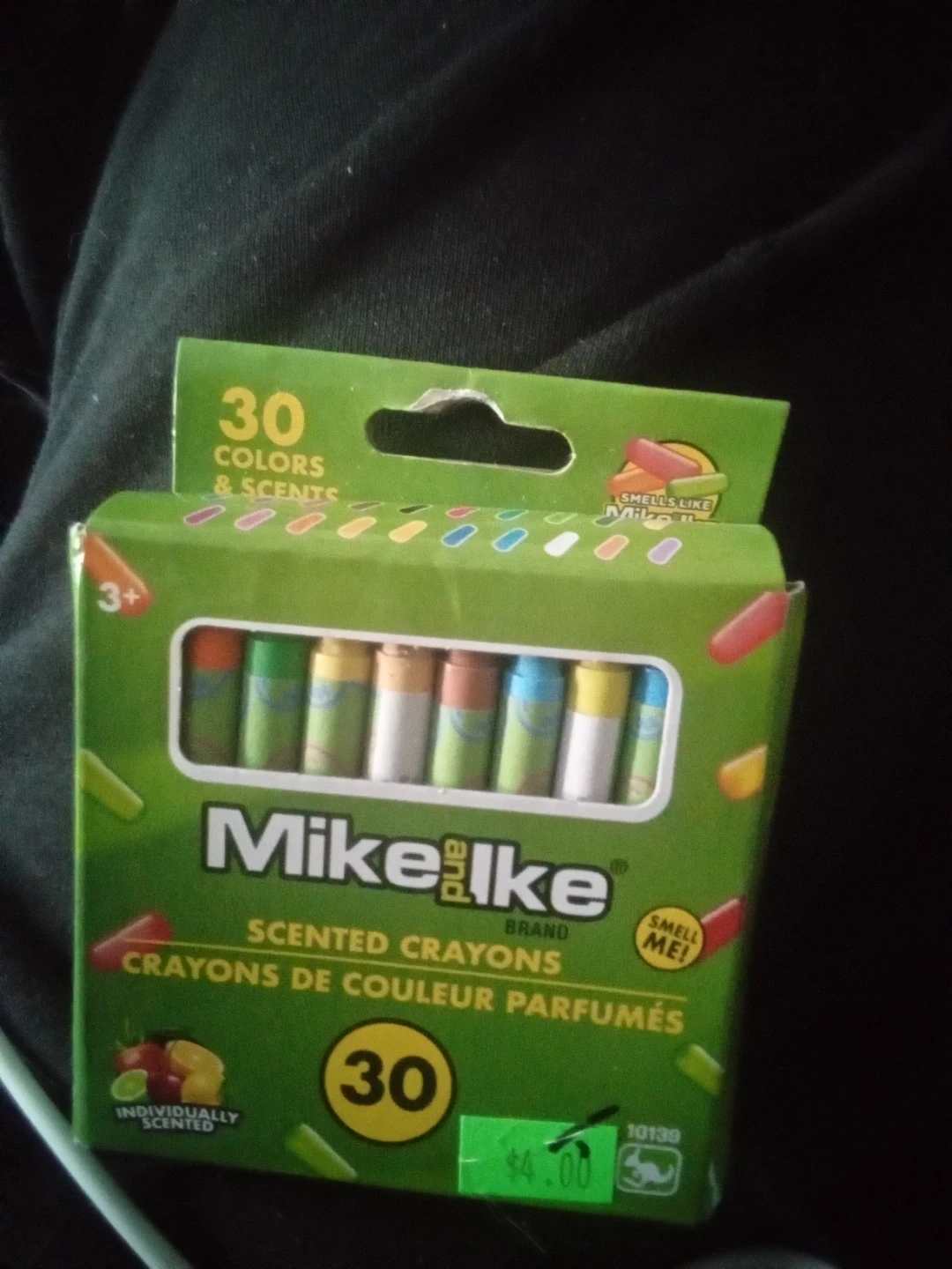Set of 30 scented crayons from Mike and Ike! Individually scented colours that smell like candy. These crayons are great for art projects and adding a fun sensory element to drawing.