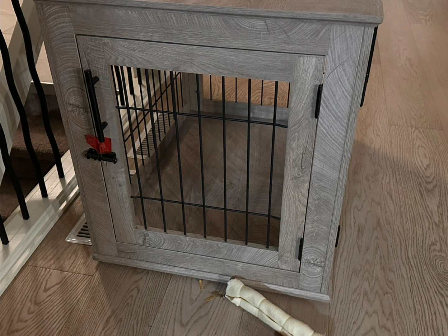 This wooden dog crate doubles as a stylish end table. It features a durable wood construction with wire caging for ventilation. The triple doors offer easy access for your pet. It's suitable for small to medium-sized dogs.