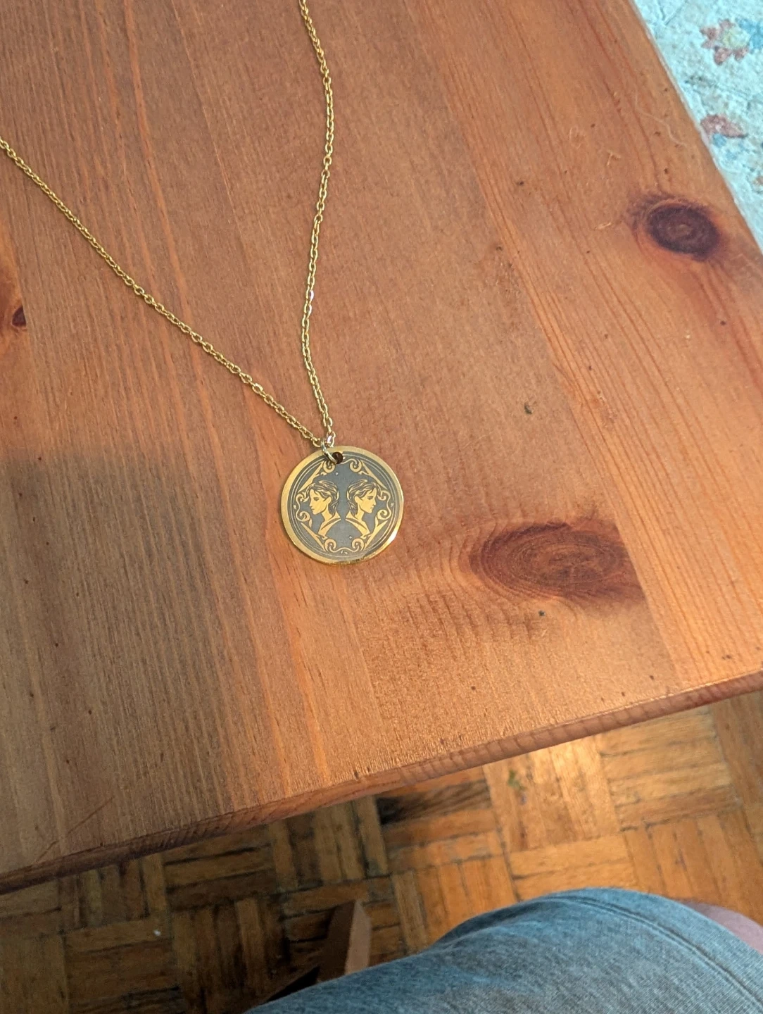 Selling a lovely gold-tone necklace! It features a delicate chain and a round medallion pendant with a unique design. The necklace is in great condition and would make a wonderful addition to any jewelry collection!