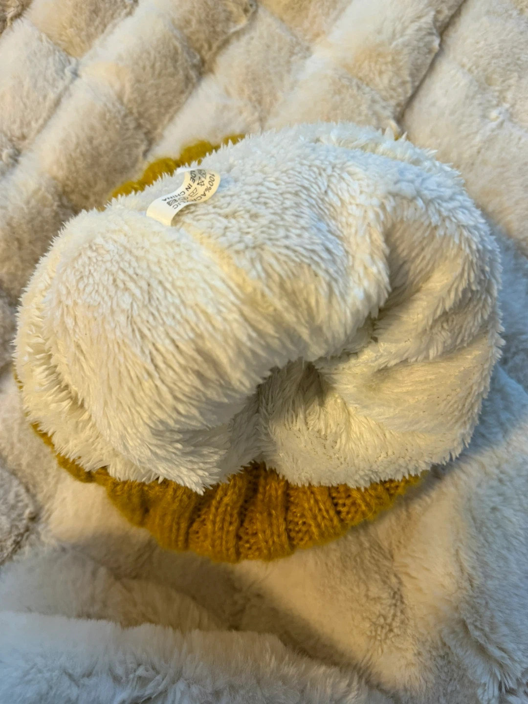 Stay warm with this cozy yellow beanie! It's knitted on the outside with a soft sherpa lining inside for extra warmth. Features a fun pom pom on top. Made in China.