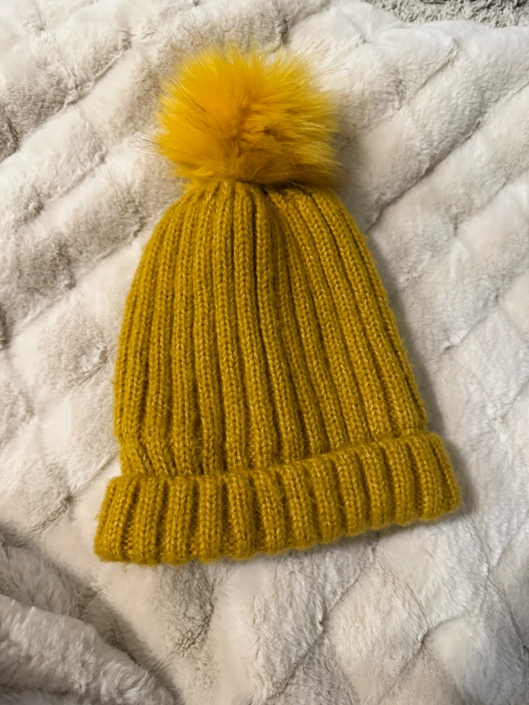 Stay warm with this cozy yellow beanie! It's knitted on the outside with a soft sherpa lining inside for extra warmth. Features a fun pom pom on top. Made in China.