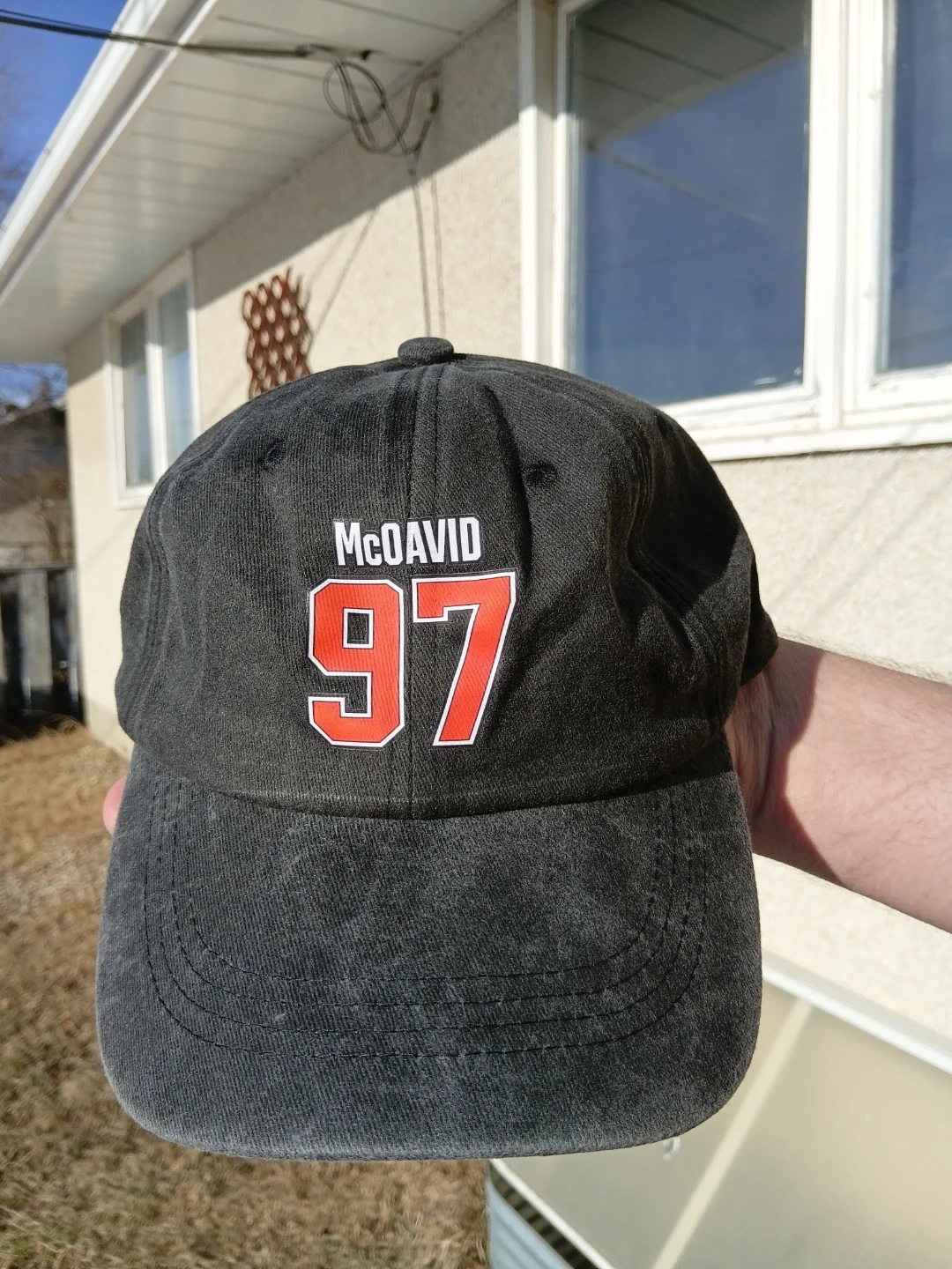 Black baseball cap with "McDavid 97" printed on the front. It's a comfortable fit for any fan. This cap is great for showing support.