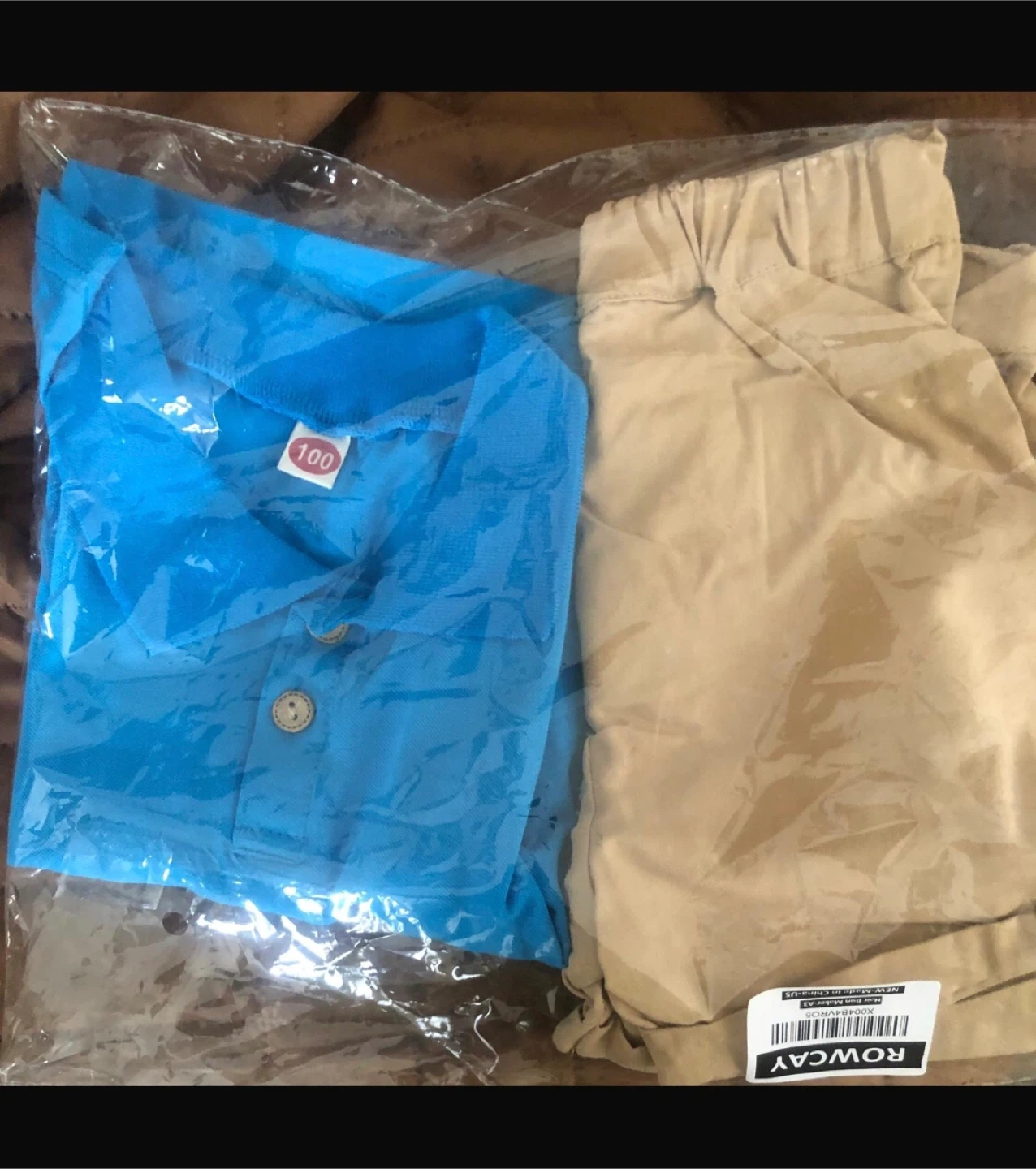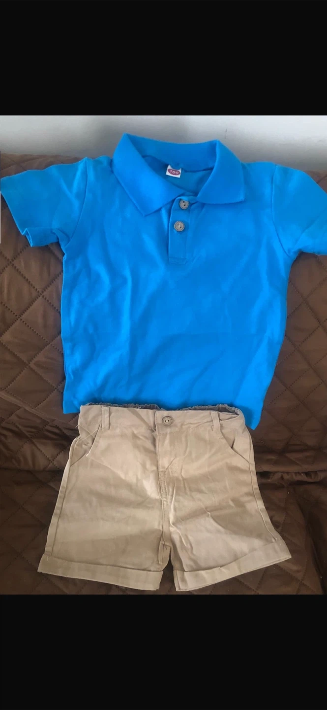 This is a boys set including a bright blue short-sleeved polo shirt and khaki shorts. The polo shirt has two buttons at the collar. The shorts have an elastic waistband for comfort.