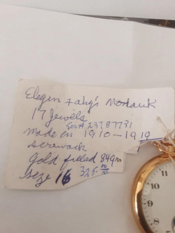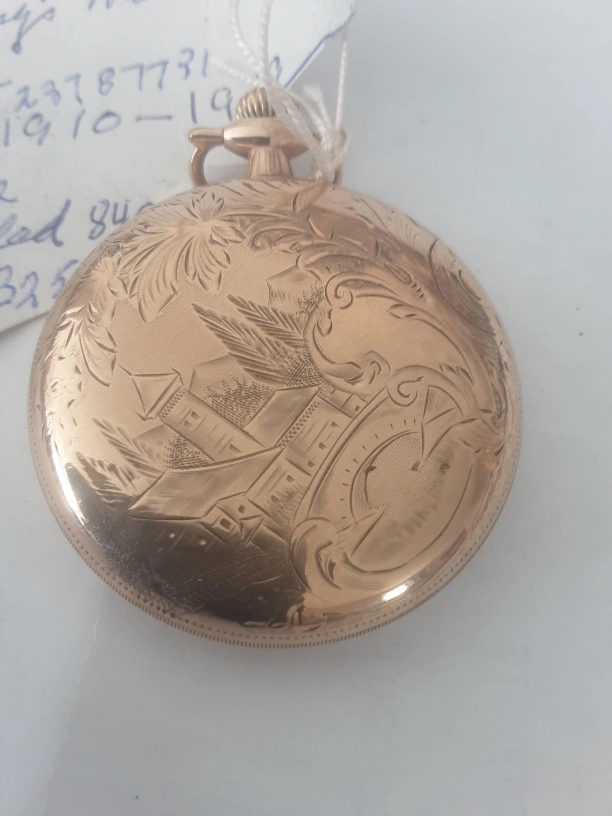 Elgin Fahys Mondauk Gold-filled pocket watch with an engraved back. 17 Jewels. Serial number 1237 87731. Made in 1910-1919. Size 16. $325.00 for viewing call 403 2411387