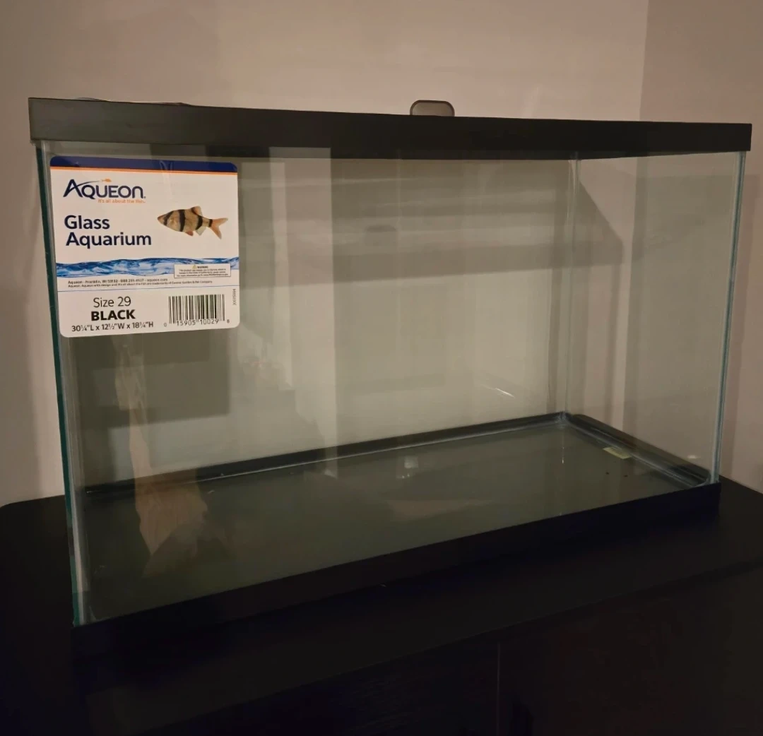 Aqueon 29 gallon glass aquarium in black. It includes a Marineland Penguin Pro 175 Power Filter and a Uniclife UL40 Air Pump. included aquarium tubing.