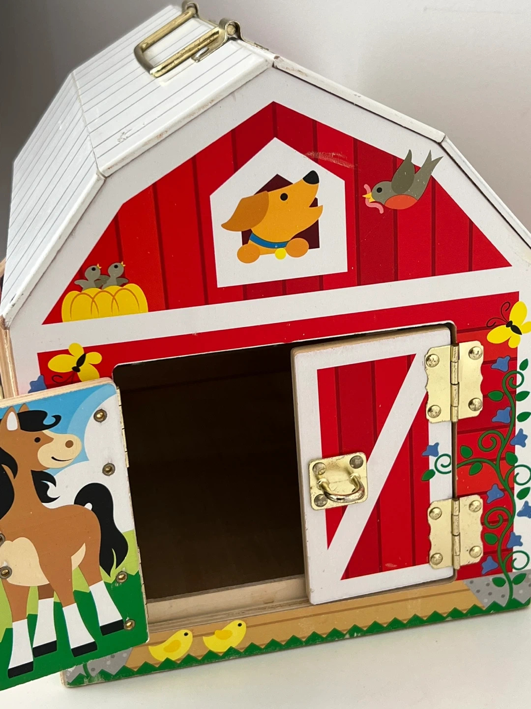 A fun wooden barnyard activity toy with multiple doors and latches. It features colourful farm animal illustrations and brass hardware. This toy encourages fine motor skill development.