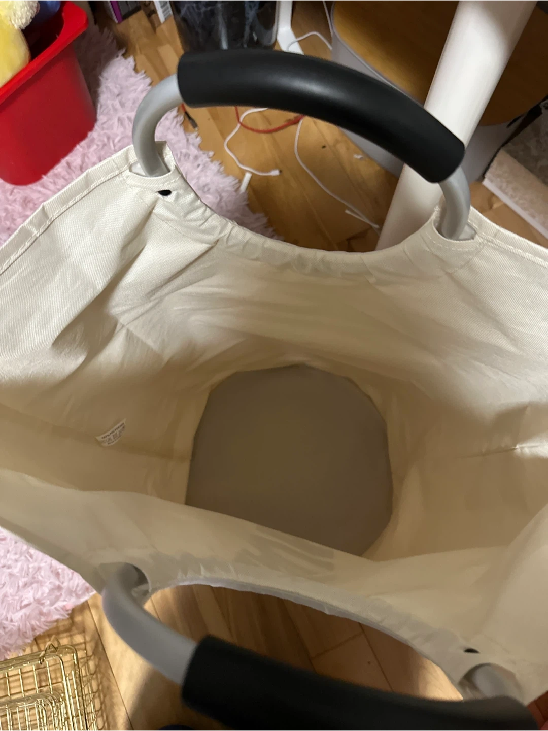 Laundry basket with sturdy handles for easy carrying. It's a beige colour and has the word 'LAUNDRY' printed on the front. Perfect for keeping your space tidy!