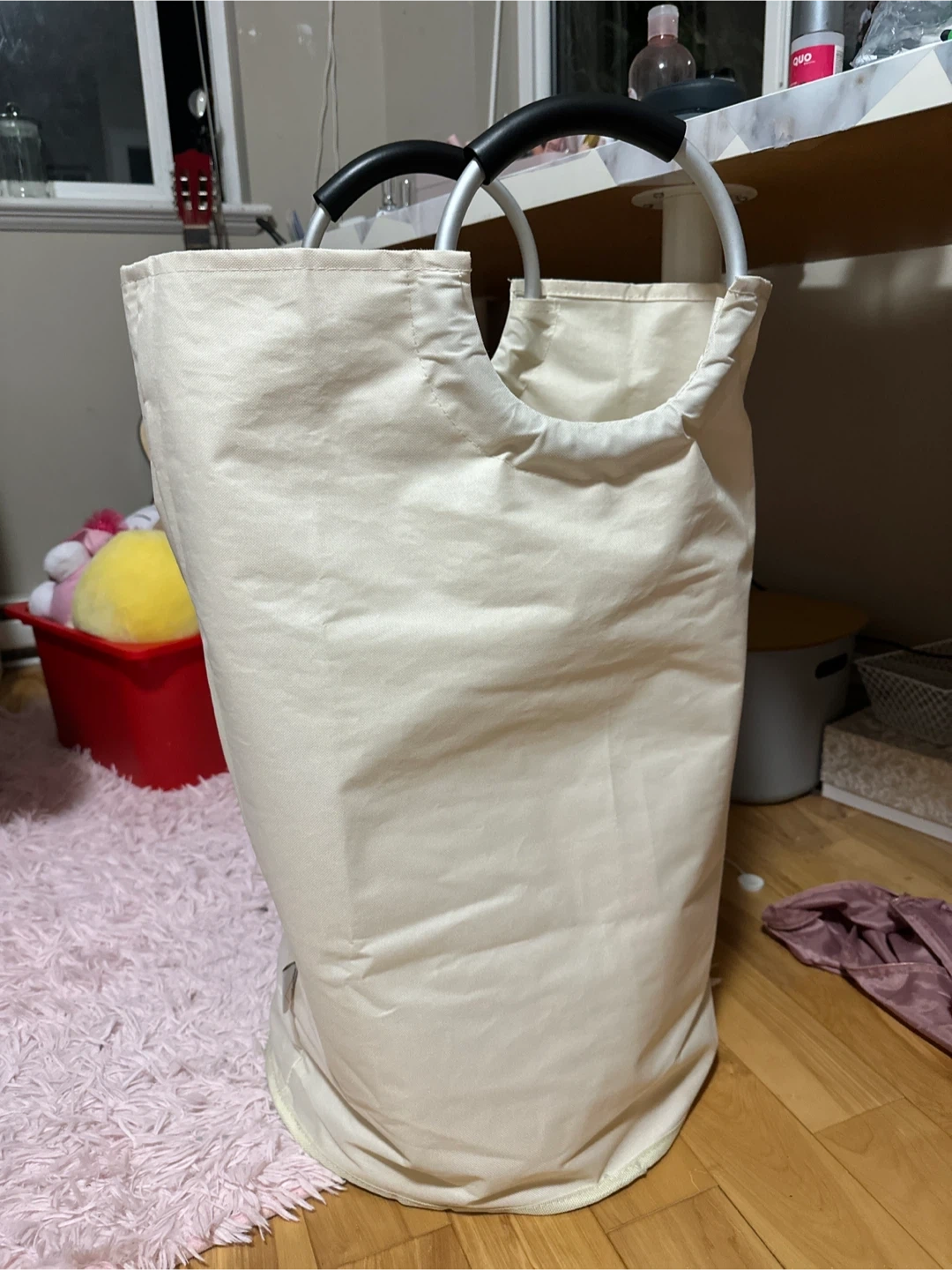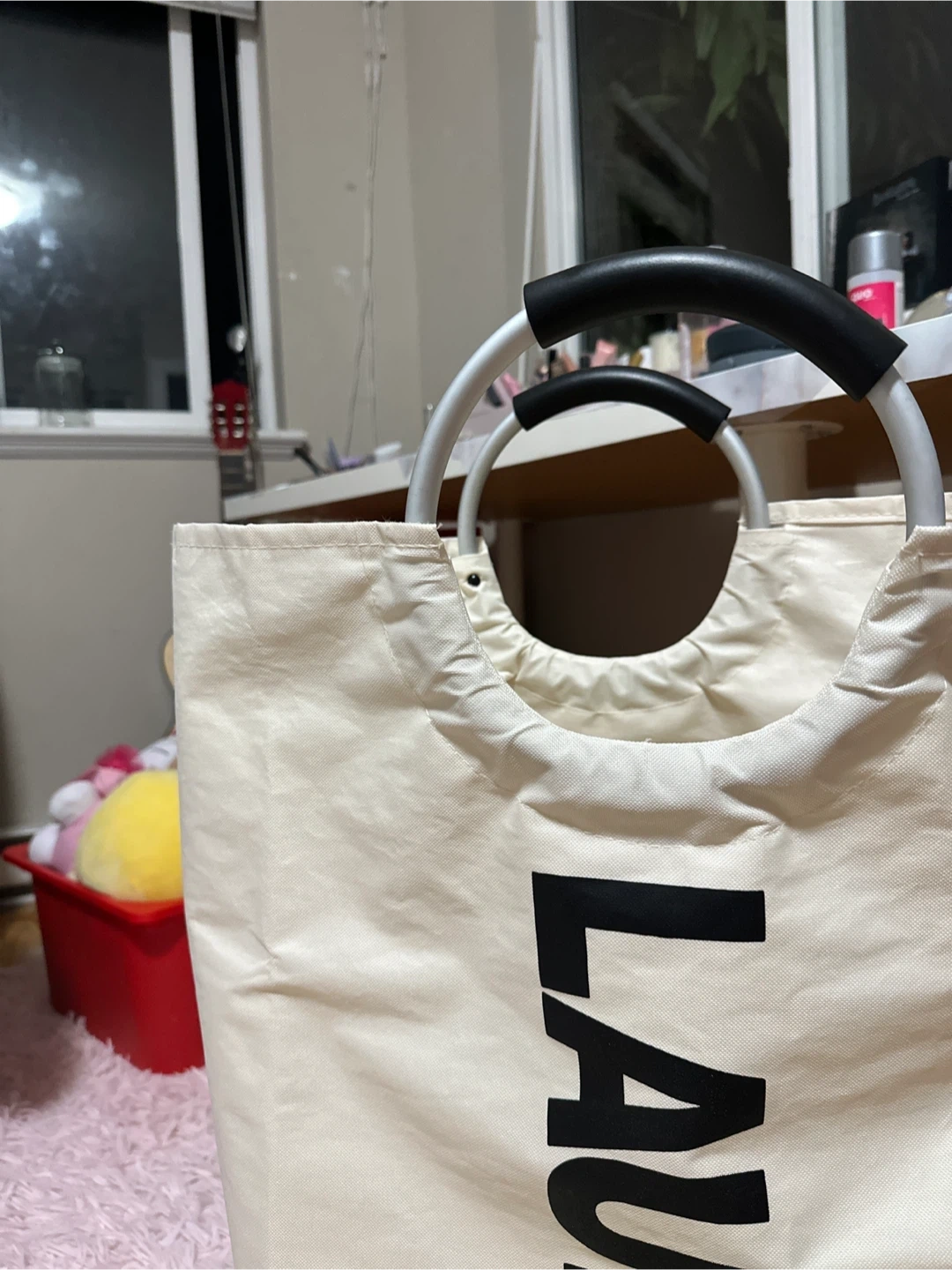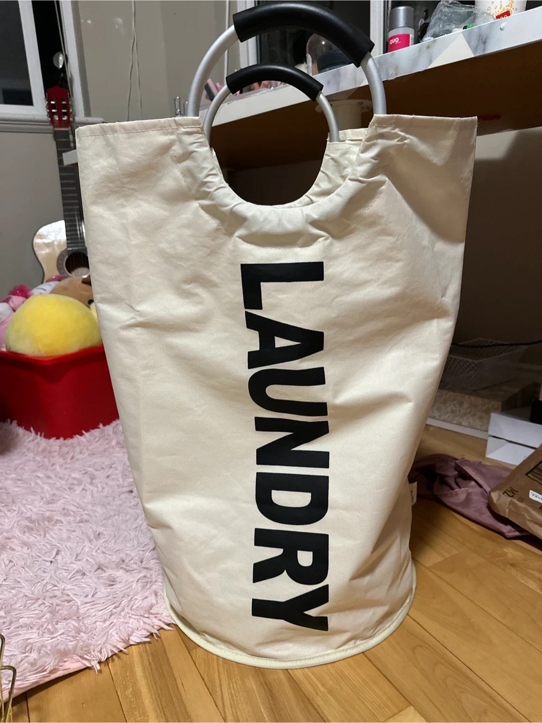 Laundry basket with sturdy handles for easy carrying. It's a beige colour and has the word 'LAUNDRY' printed on the front. Perfect for keeping your space tidy!