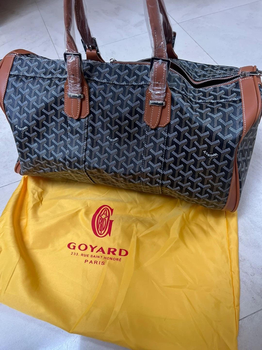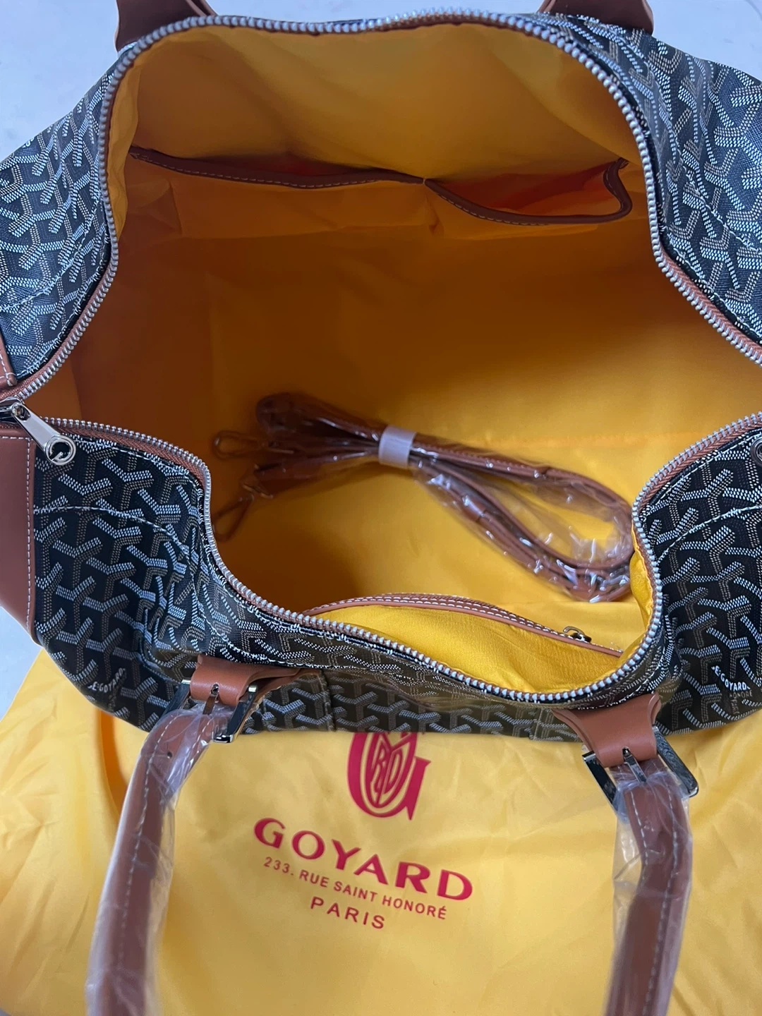 This is a Goyard travel duffel bag. It features the signature Goyardine canvas with leather trim. The interior has multiple pockets. Comes with its original dust bag.