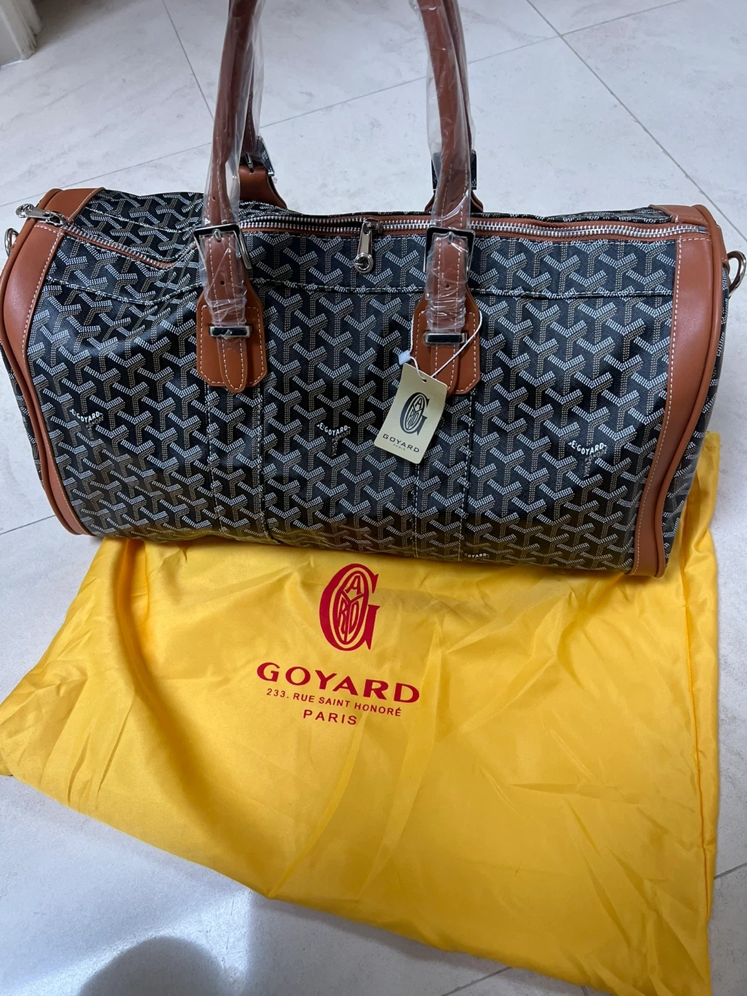 This is a Goyard travel duffel bag. It features the signature Goyardine canvas with leather trim. The interior has multiple pockets. Comes with its original dust bag.