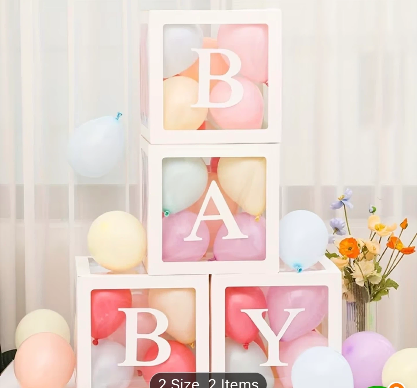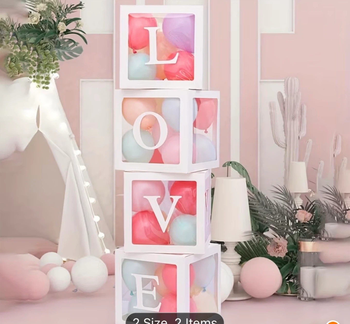 White decorative blocks spell out 'LOVE' and 'BABY' with clear sides to display balloons or other decorations. These blocks are perfect for baby showers, gender reveals, and parties. Cardboard and plastic construction.