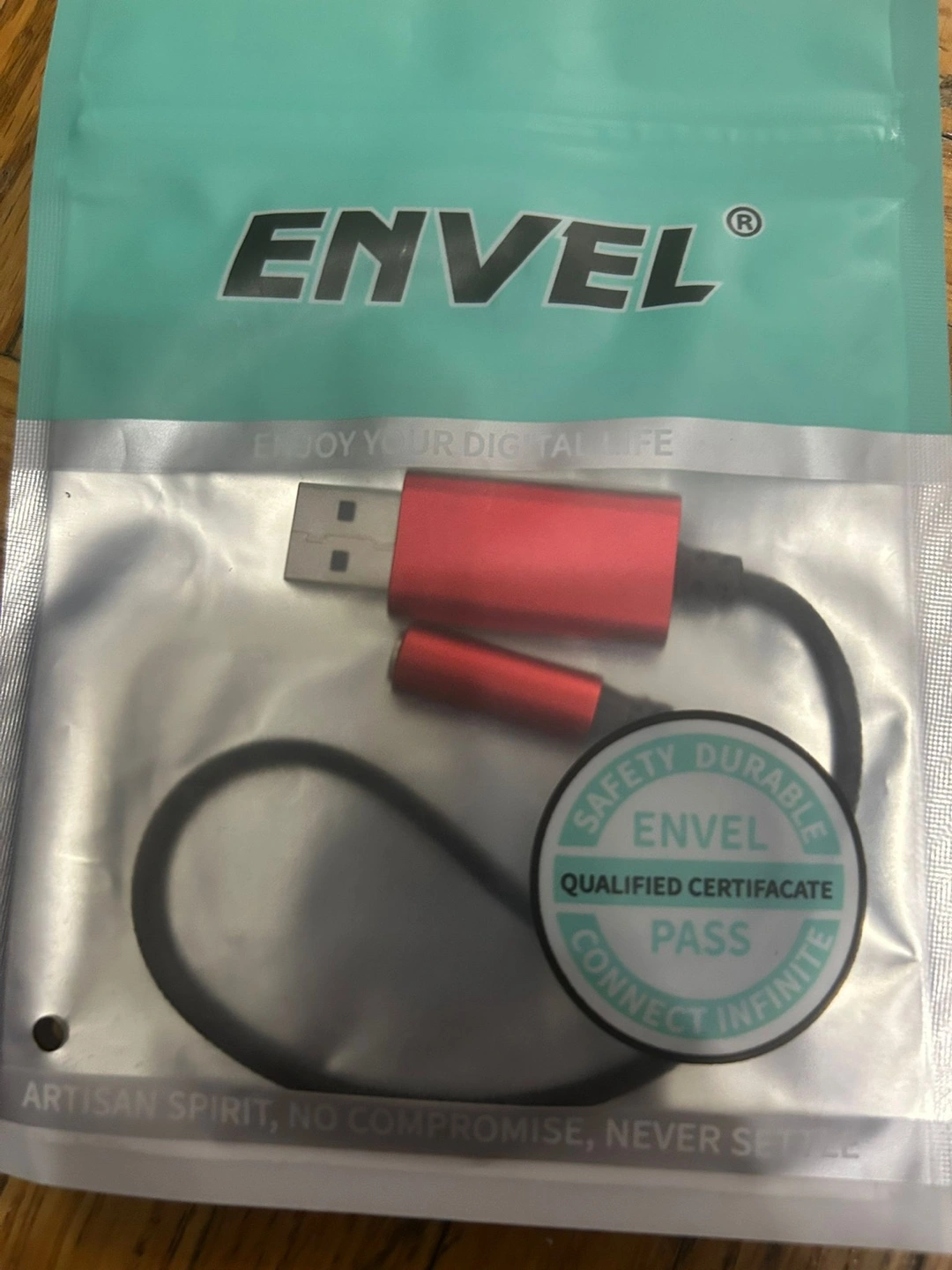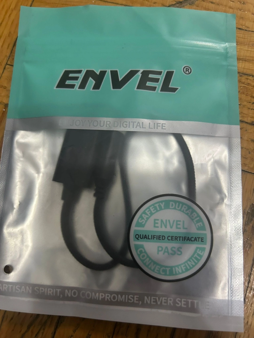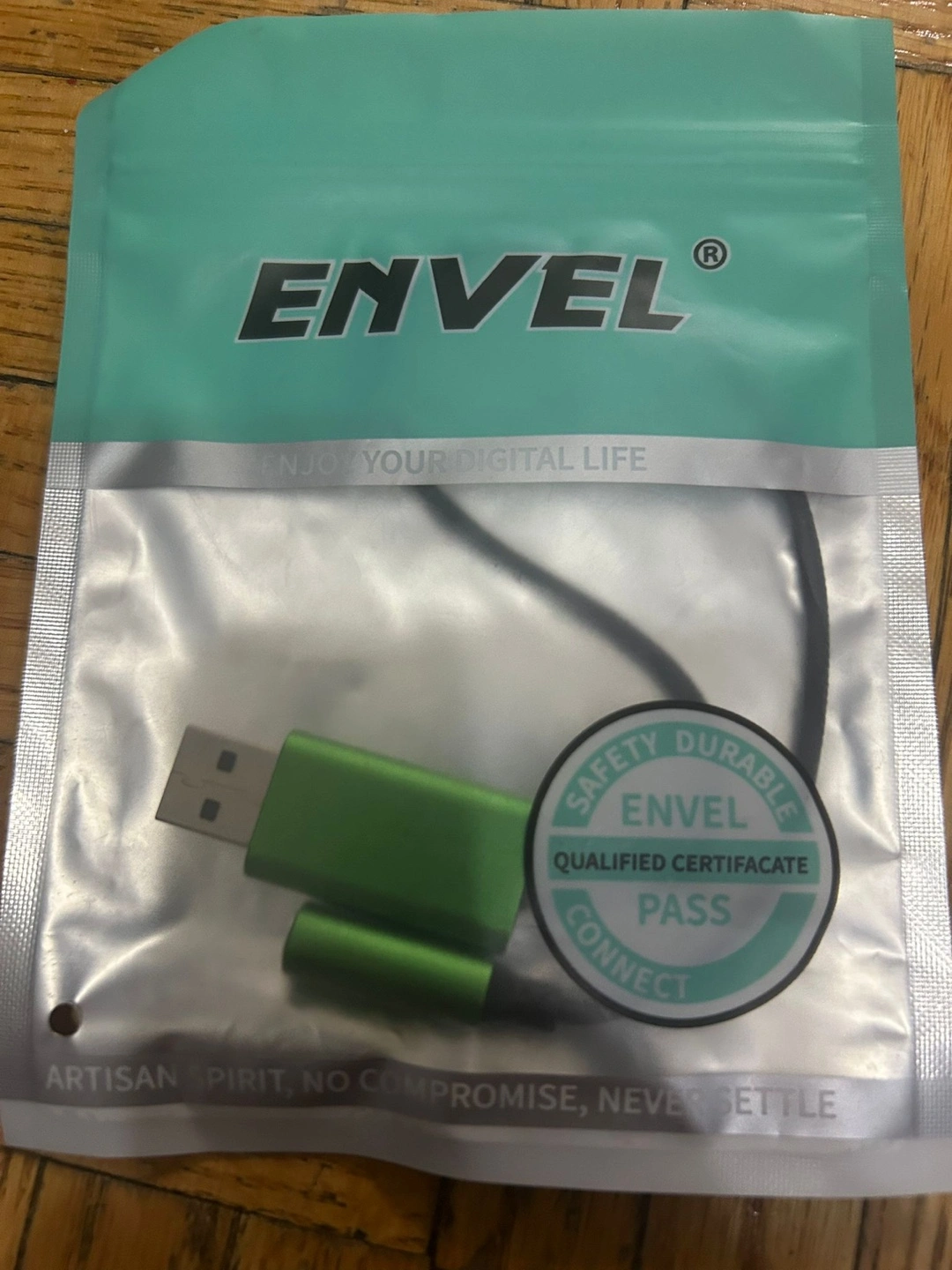 Selling a new Envel USB cable! It's still in its original packaging. This cable is both durable and safe, perfect for connecting your devices. It's a qualified certificate pass for assured quality.