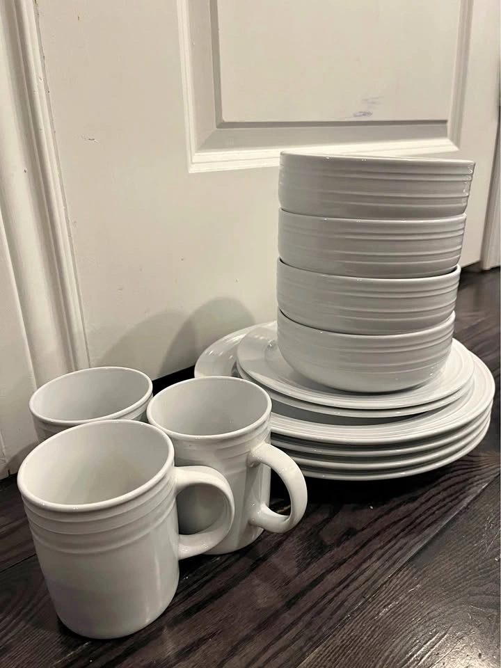 White porcelain dinnerware set. Includes 4 dinner plates, 2 salad plates, 4 bowls, and 3 coffee mugs. Features a simple modern design with horizontal ridges. Great for everyday meals.