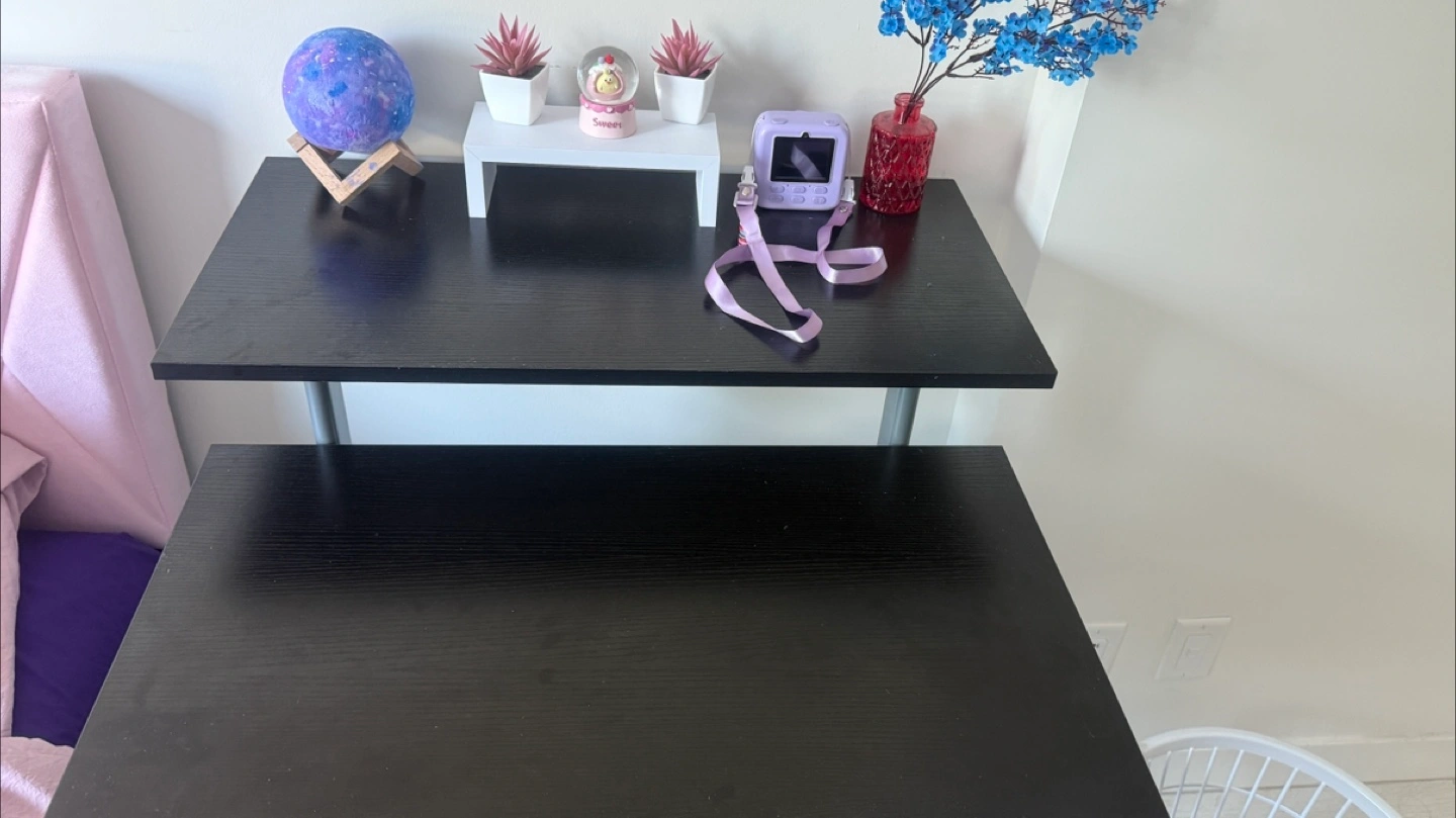 Selling a versatile rolling desk with adjustable height! It's great for creating a flexible workspace in any room. The desk features a black finish and a sturdy metal frame with wheels for easy mobility. Perfect for small spaces or anyone who needs a desk that can be moved around easily
