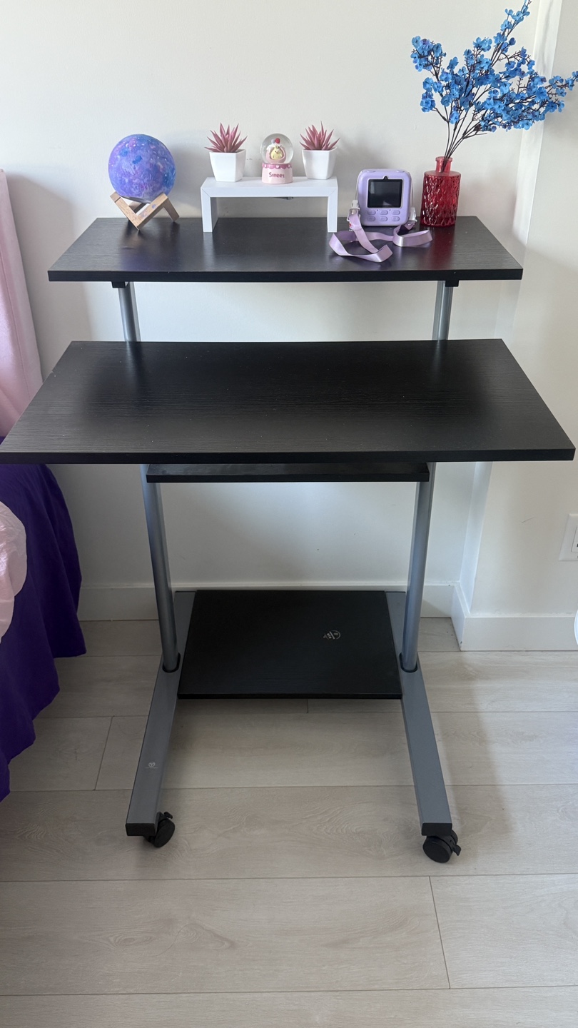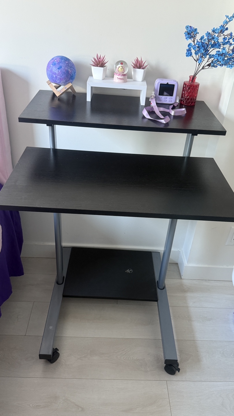 Selling a versatile rolling desk with adjustable height! It's great for creating a flexible workspace in any room. The desk features a black finish and a sturdy metal frame with wheels for easy mobility. Perfect for small spaces or anyone who needs a desk that can be moved around easily