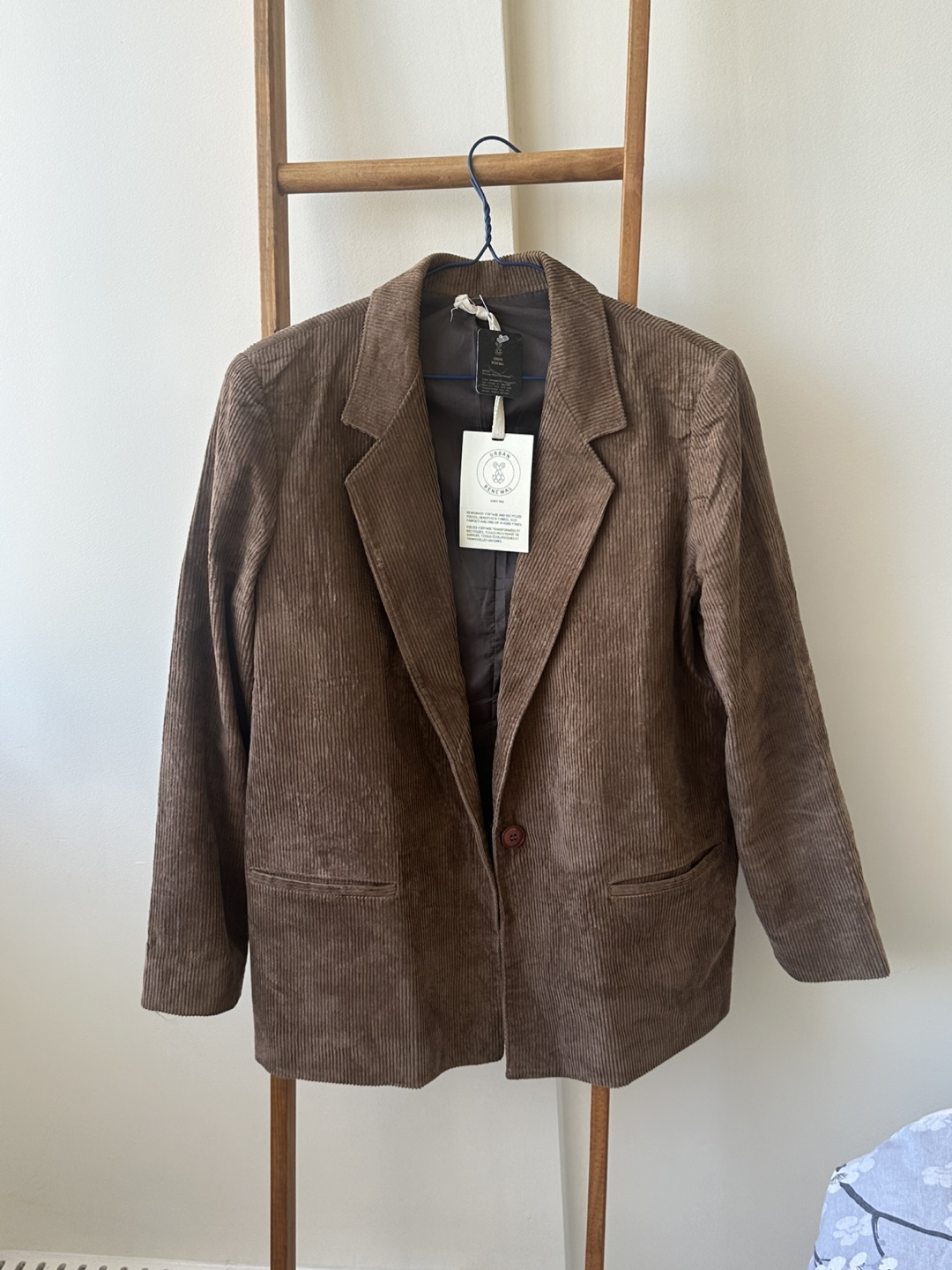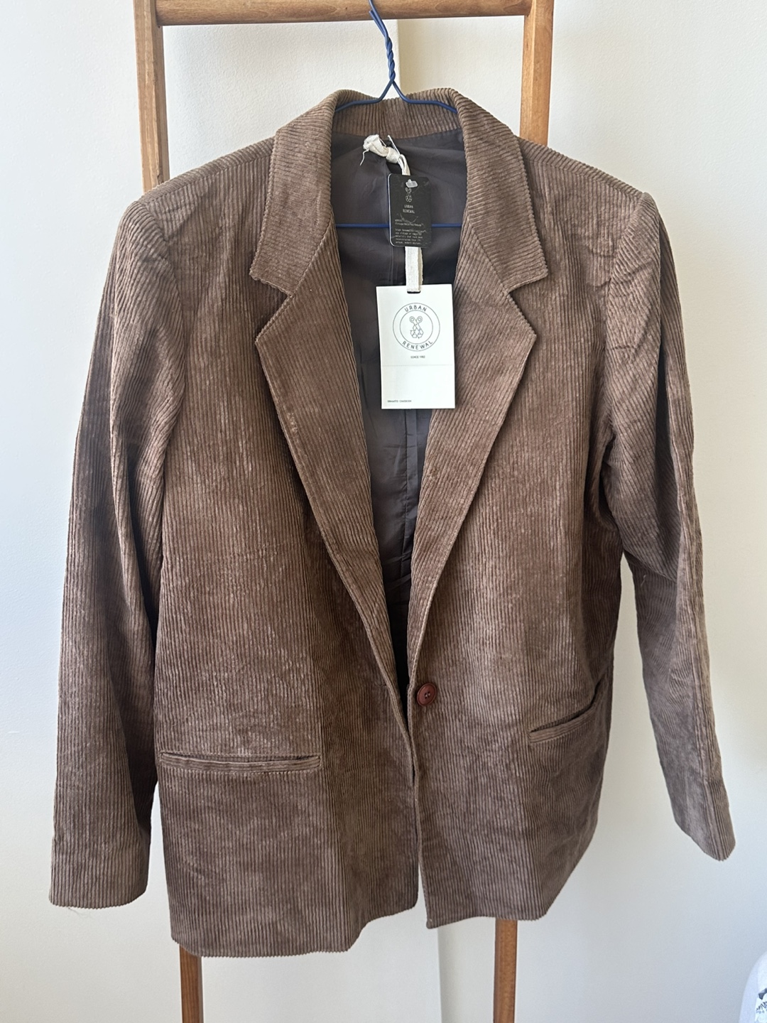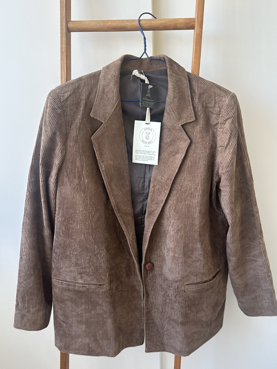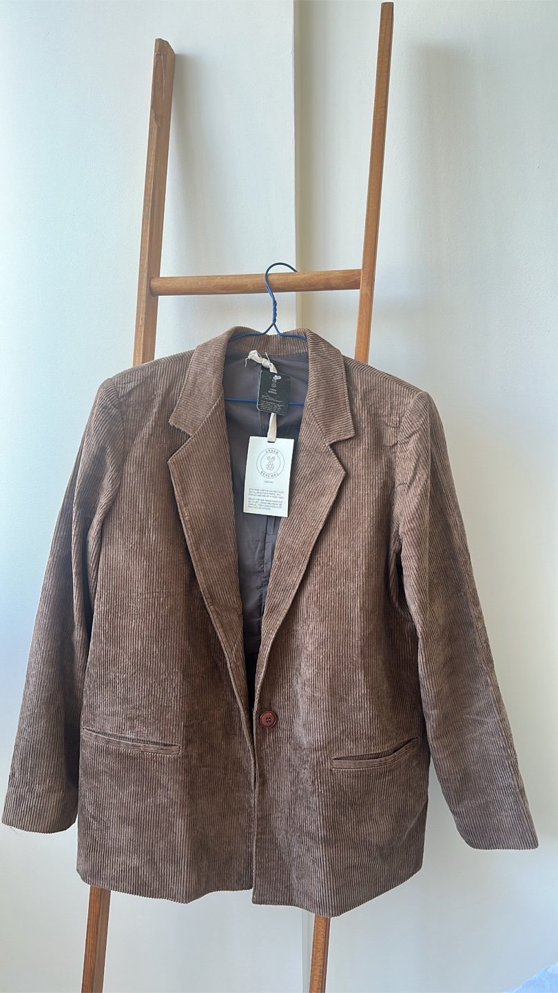 Urban Renewal corduroy blazer in a stylish tan colour! This blazer is perfect for adding a touch of vintage flair to any outfit. The corduroy material gives it a unique texture and look. It's in great condition and ready for a new home!