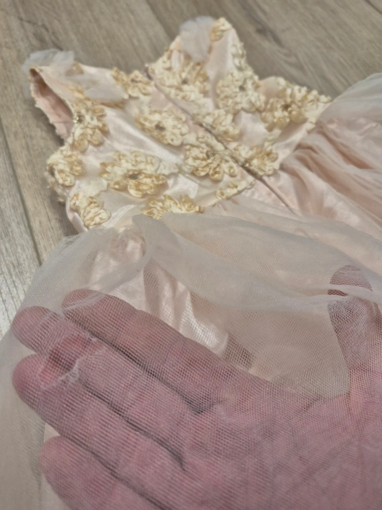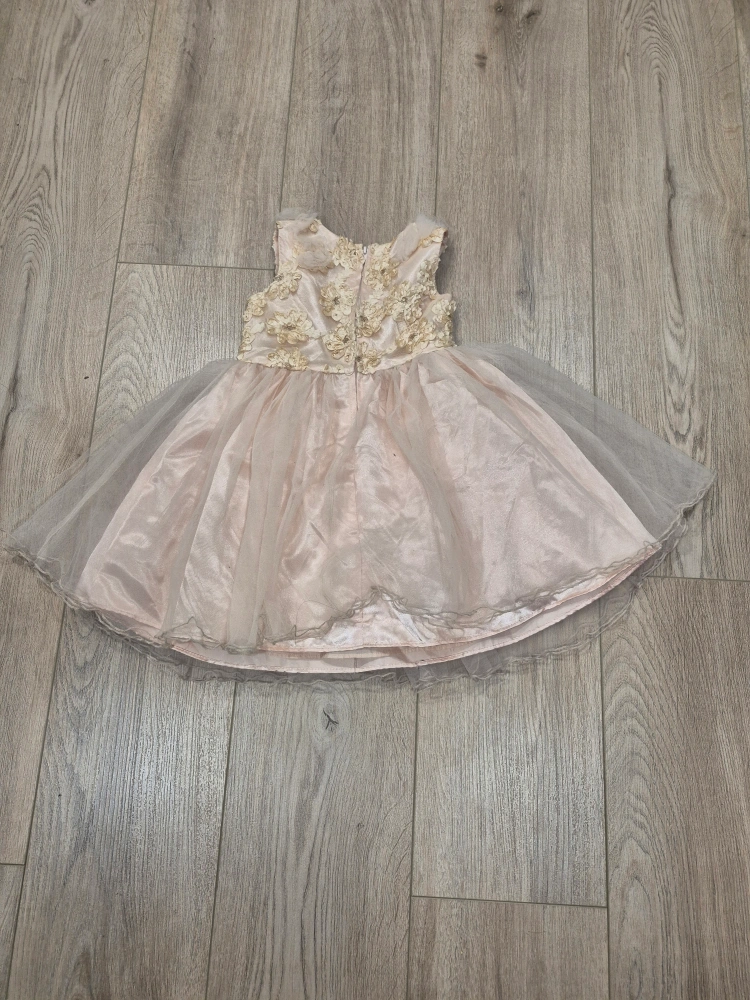 92This is a charming dress with a decorative floral design on the bodice and a ribbon at the waist, perfect for special occasions. It is in good condition, with some minor wear on the tulle, as you can see from the photos. Features: - Decorative bodice - Ribbon waist - Tulle overlay Check my other listing for more kids items! Bundle Deals Available.