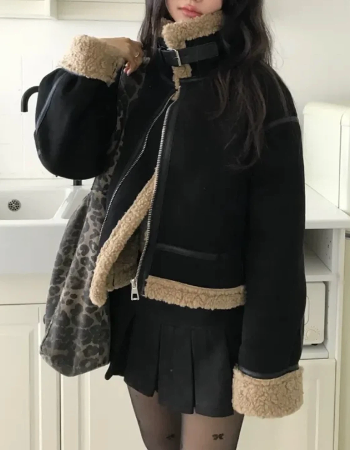 A stylish mustang jacket. It's got a zip-up front and buckle detail at the collar. Perfect for this weather!