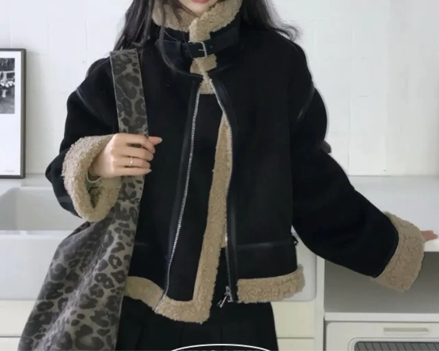 A stylish mustang jacket. It's got a zip-up front and buckle detail at the collar. Perfect for this weather!