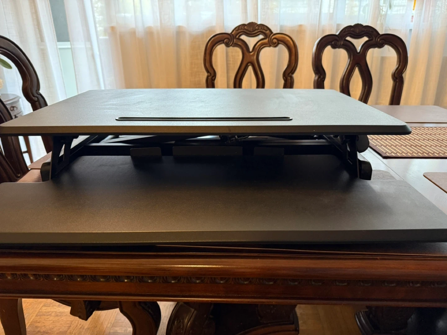 Selling a handy adjustable standing desk converter! It's in great shape and perfect for turning any regular desk into a standing workspace. It's a simple way to improve your posture and stay active while working from home!