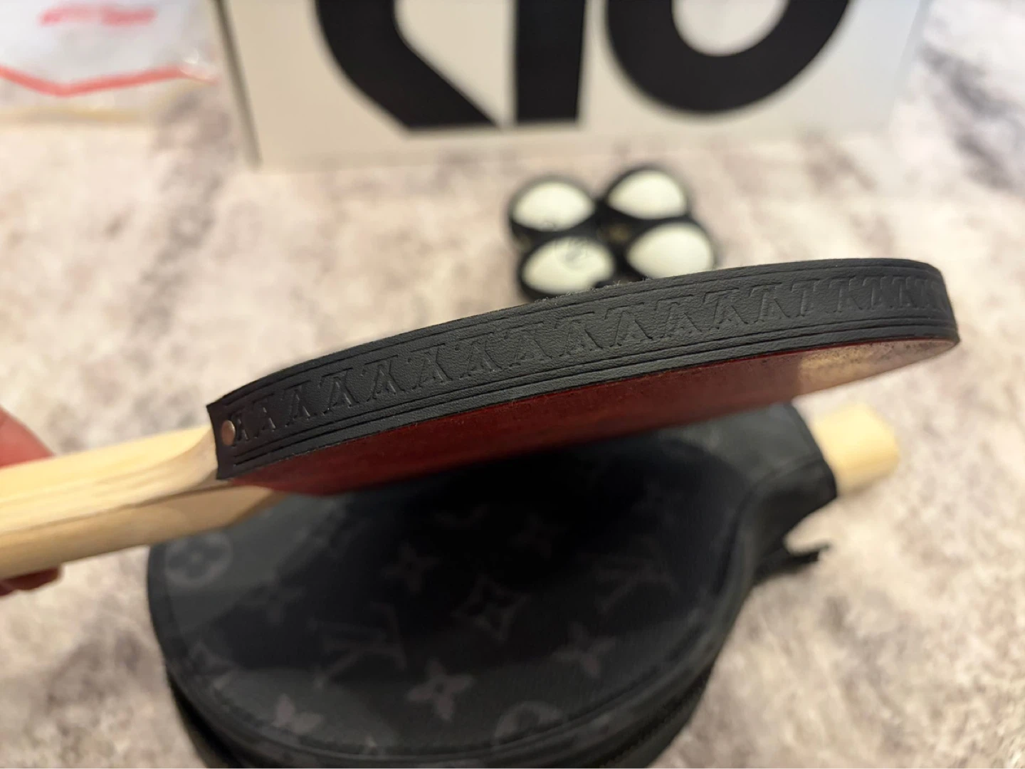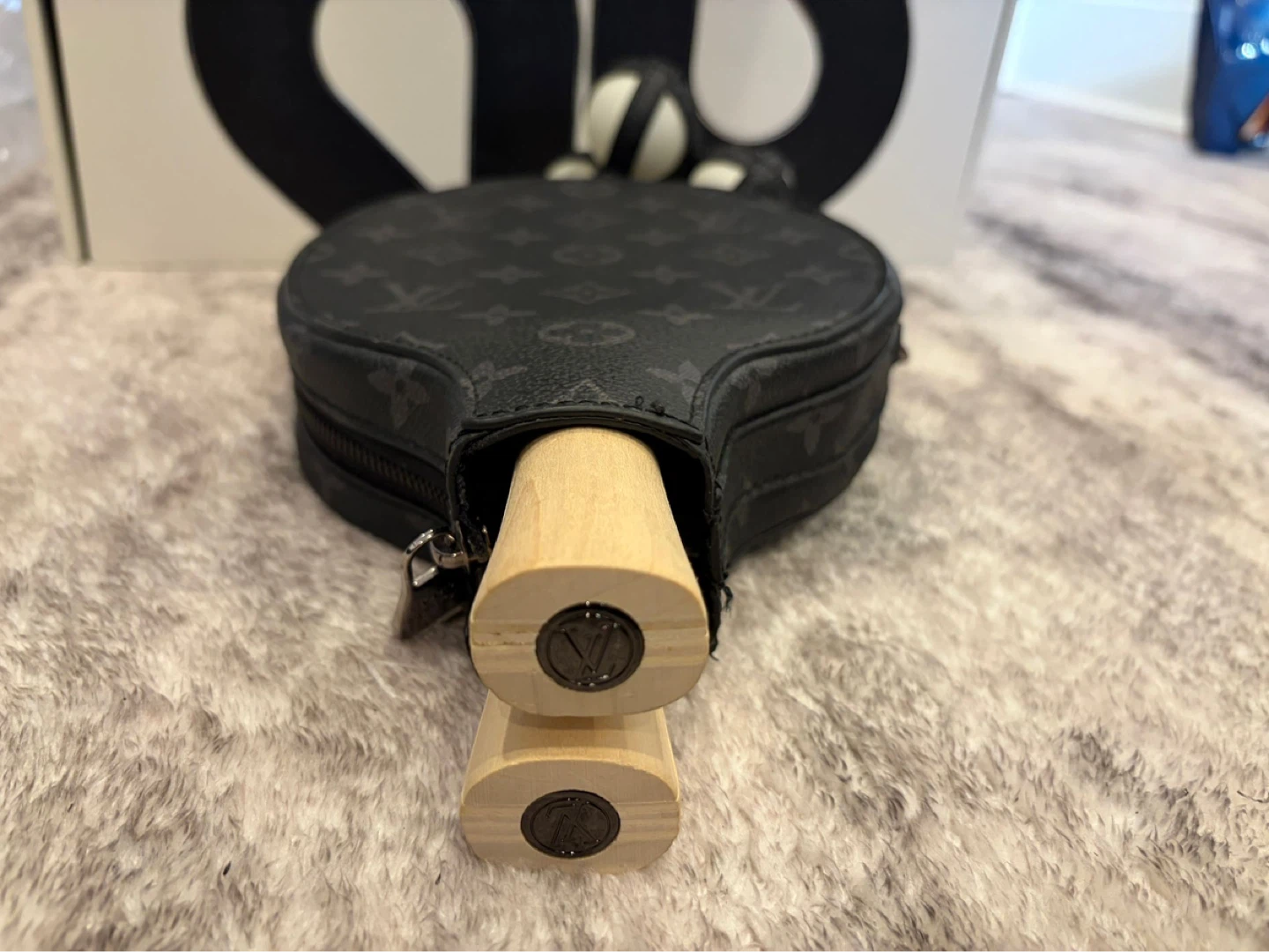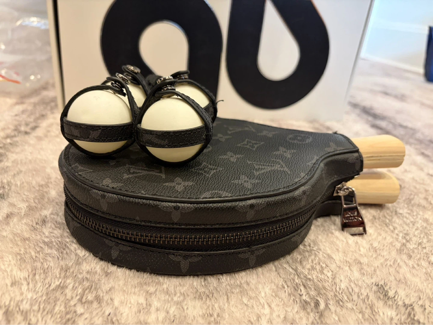This Louis Vuitton ping pong set includes a paddle and four balls. It features the iconic monogram pattern on the paddle's protective case. The wooden handles have the LV emblem. A stylish way to enjoy a game!