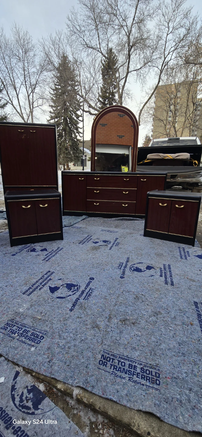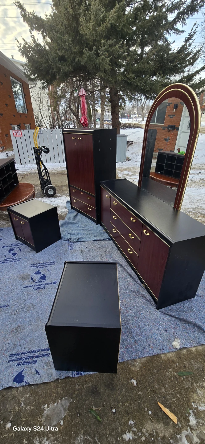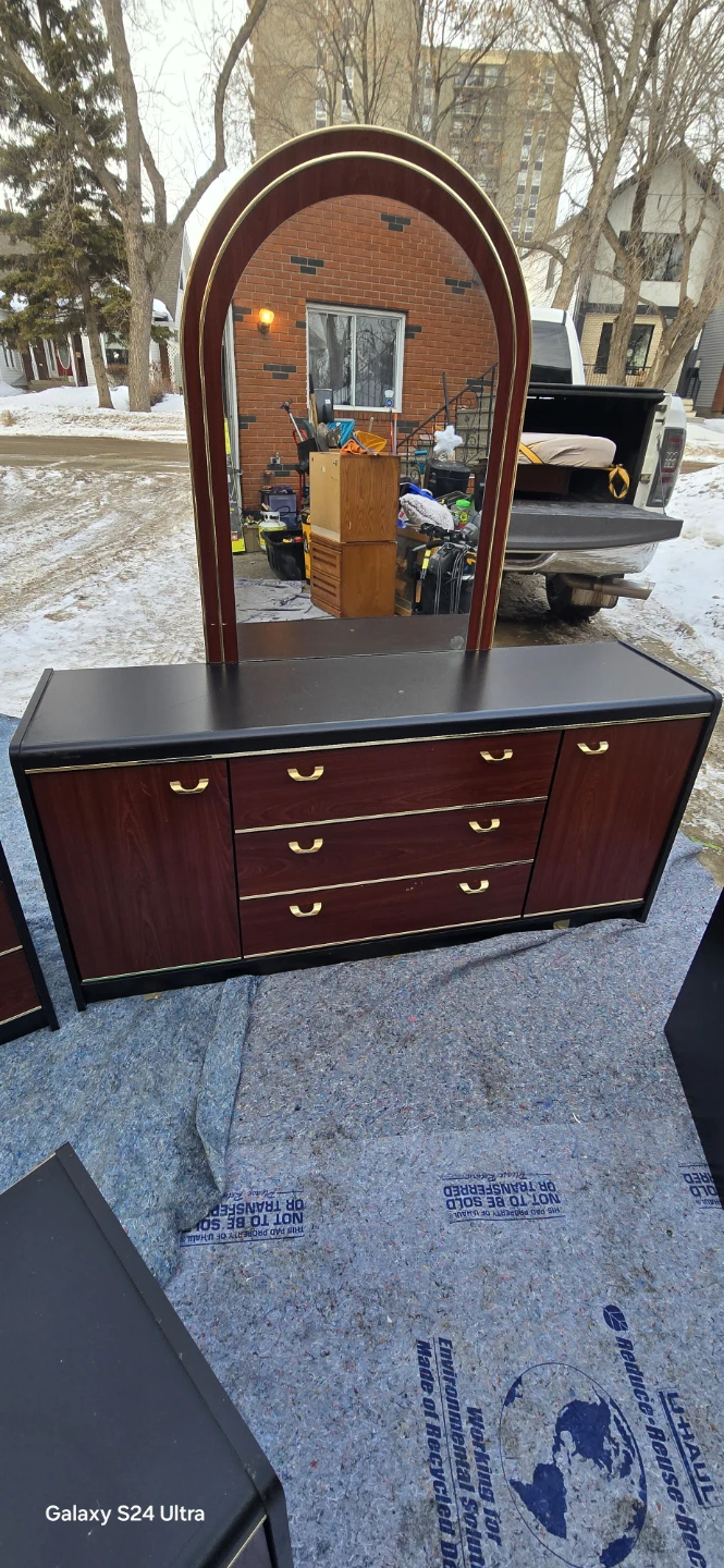 Beautiful vintage bedroom furniture set in a rich dark walnut finish. Solid, heavy, and well-built — not modern particle board. Clean classic lines with brass-tone hardware.