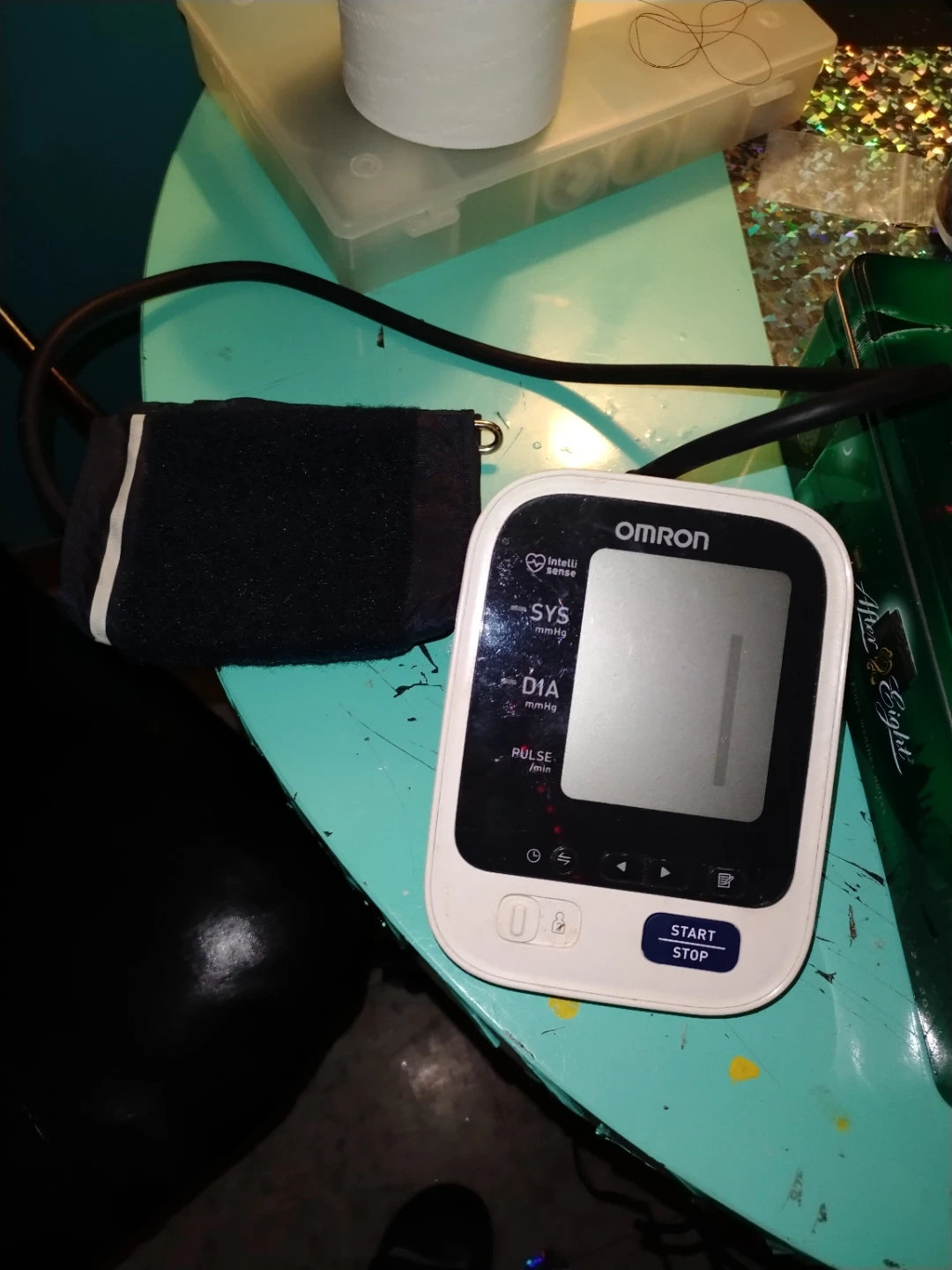 OMRON IntelliSense blood pressure monitor. Digital display shows SYS, DIA, and pulse readings. Includes cuff and main unit. Easy one-touch operation with Start/Stop button.