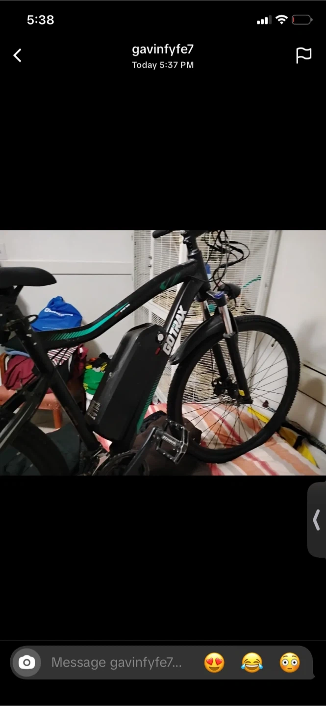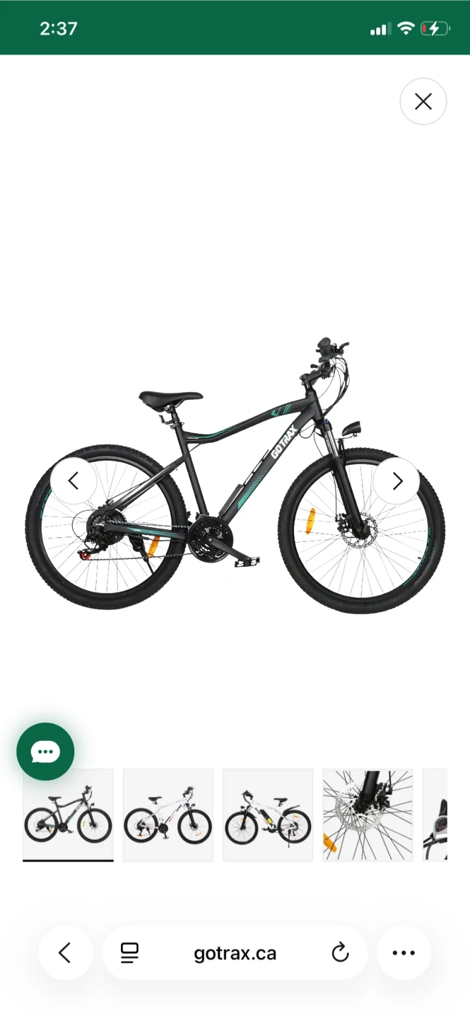 GoTrax electric bike with a long-range battery. It's a black frame bike with teal accents. This e-bike is great for getting around town!