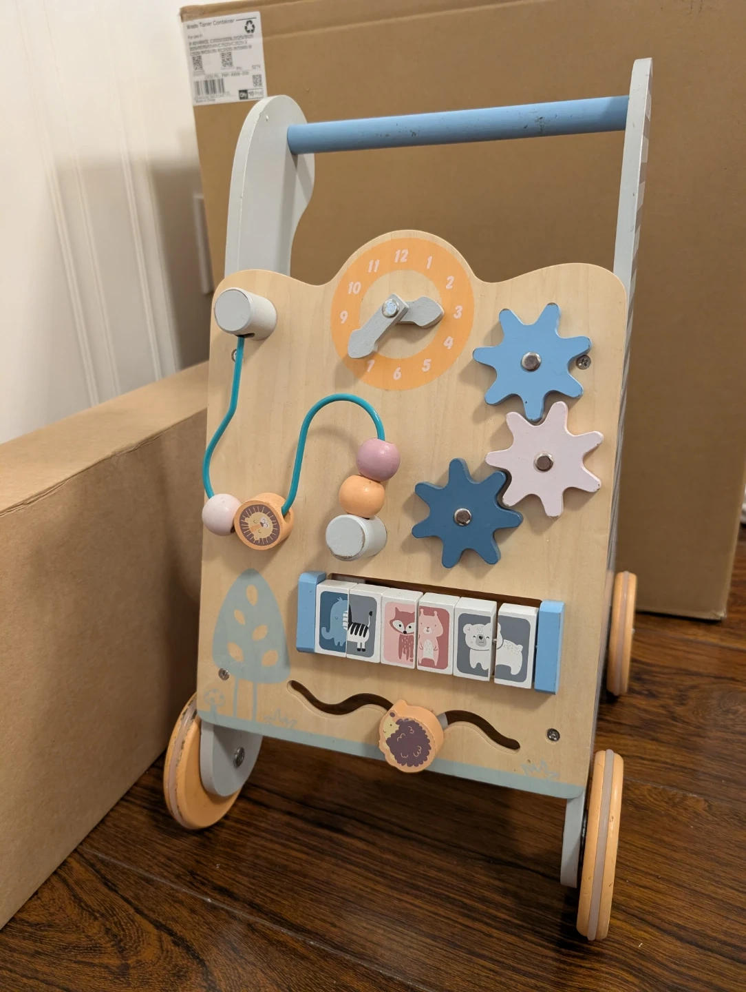 This PolarB wooden walker is perfect for little ones learning to walk. It's equipped with gears, a clock face, and animal buttons for interactive play. Designed to engage and entertain toddlers.