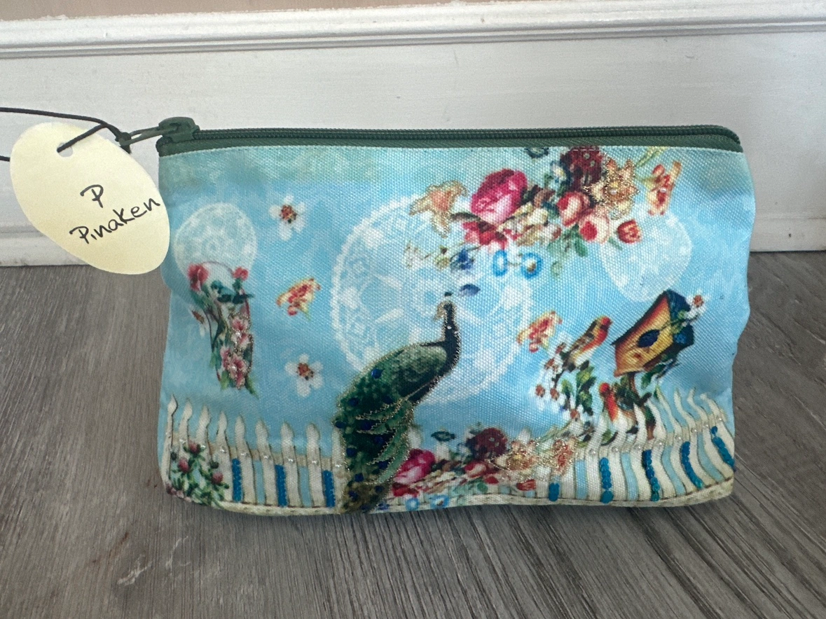 New and tagged light blue canvas makeup/toiletry bag with a peacock, floral design and sequins accent detailing.