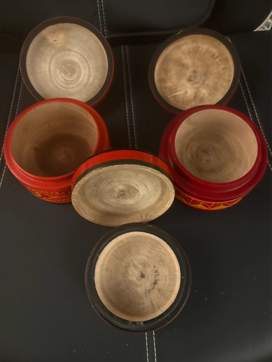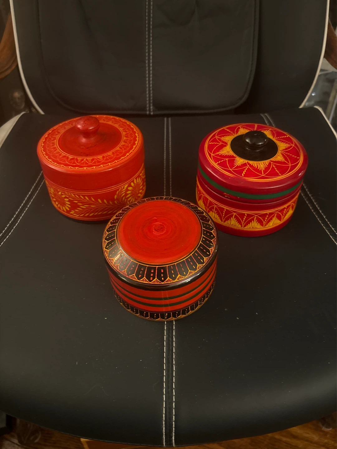 This is a set of three decorative wooden trinket boxes with painted floral designs. They are made of wood and feature a red, yellow, and black colour scheme. These boxes are great for storing small items like jewelry or keepsakes. 1 is from Burma and the other similar 2 are from Sri Lanka. All in excellent condition. Part of a collection I have been clearing out priced for all 3