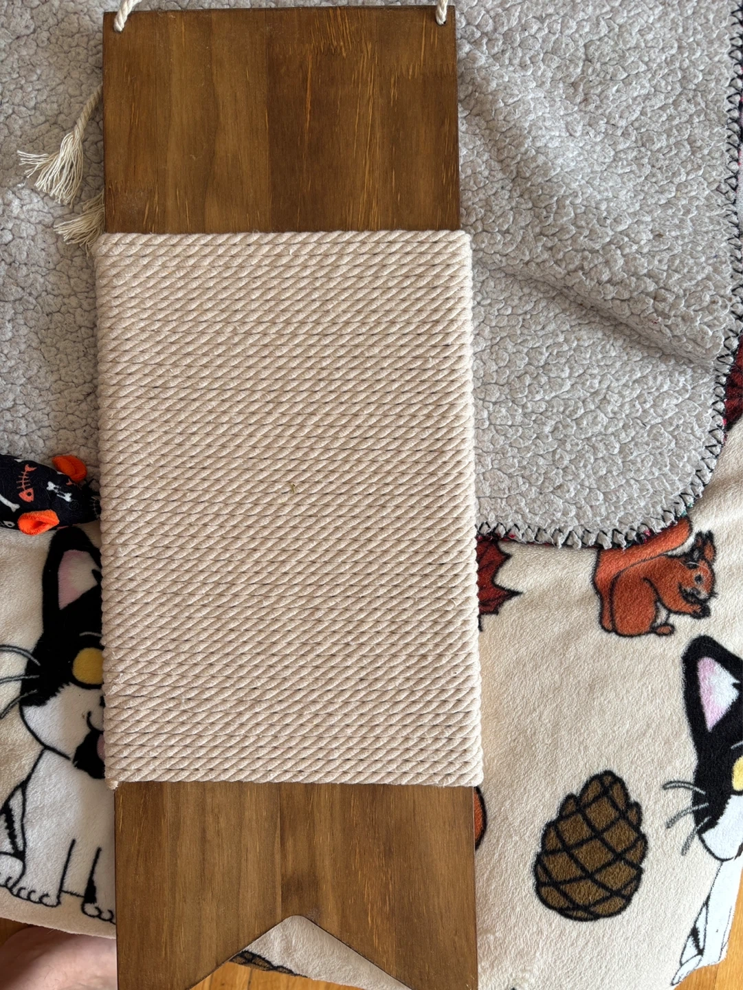 This cat scratching post is wrapped in rope, mounted on a wooden board. It includes a macrame hanging rope. Great quality as any of their products.
